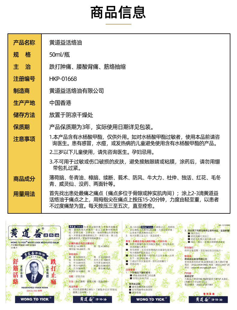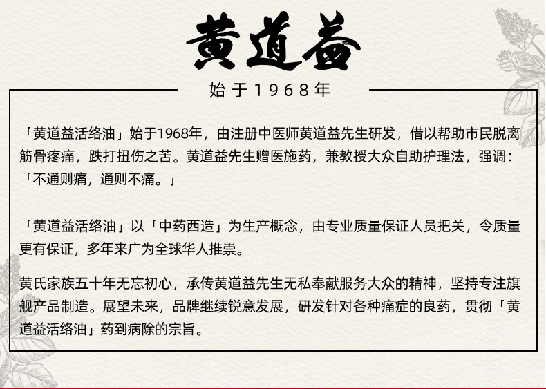 黄道益活络油,是中国香港老中医黄道益医师集数十年临床经验创制的活络油,选用高质天然药料,配以止痛药材精炼而成,舒筋活络,去瘀生新,增强身体自然康复机能。缓解腰酸背痛的症状,治疗跌伤肿胀,以及头晕眼花疗效较好。