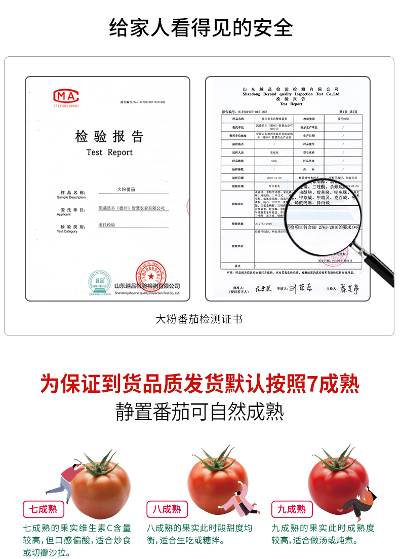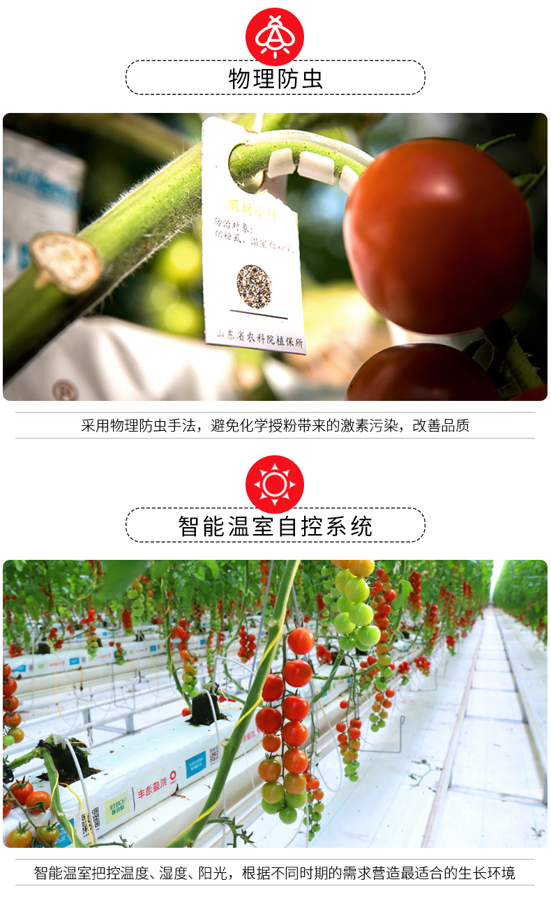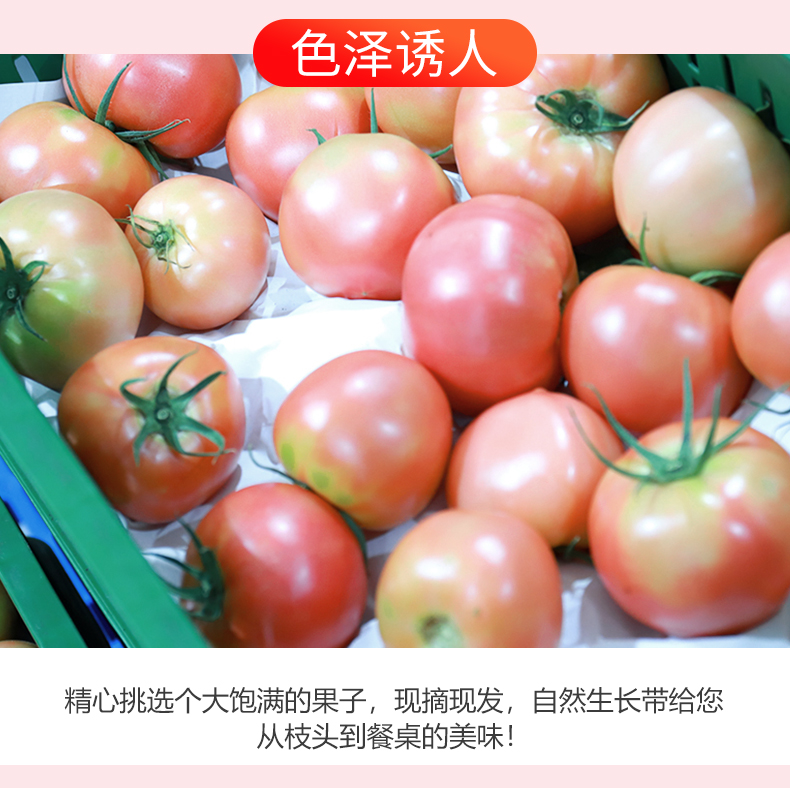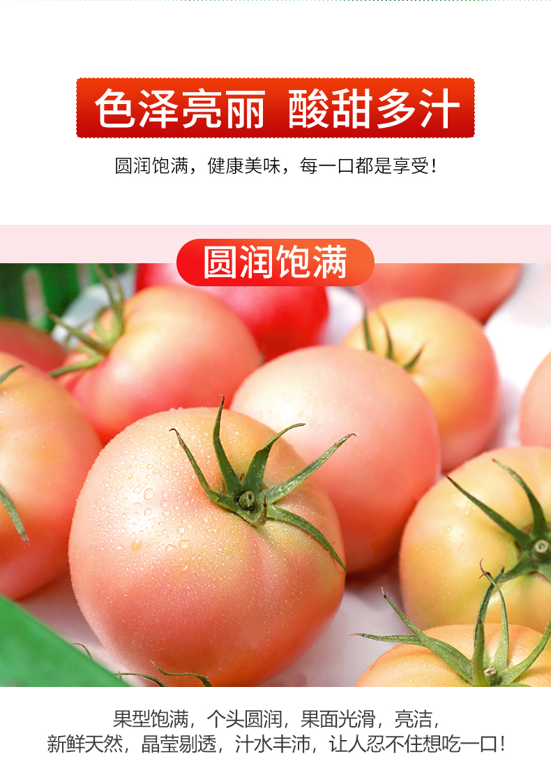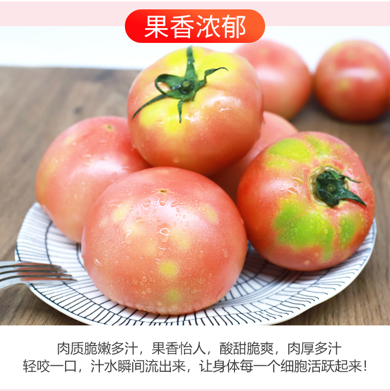 这款桃太郎番茄是来自日本的番茄品种,果实品质优,呈桃圆形,大小较均匀。整圆,色泽鲜艳,浓桃红色。果肉厚,果肉紧,不易腐烂。可溶性固型物高达5%,口感鲜甜。种植过程中不打药,不催熟,到手后直接清水清洗即可食用。