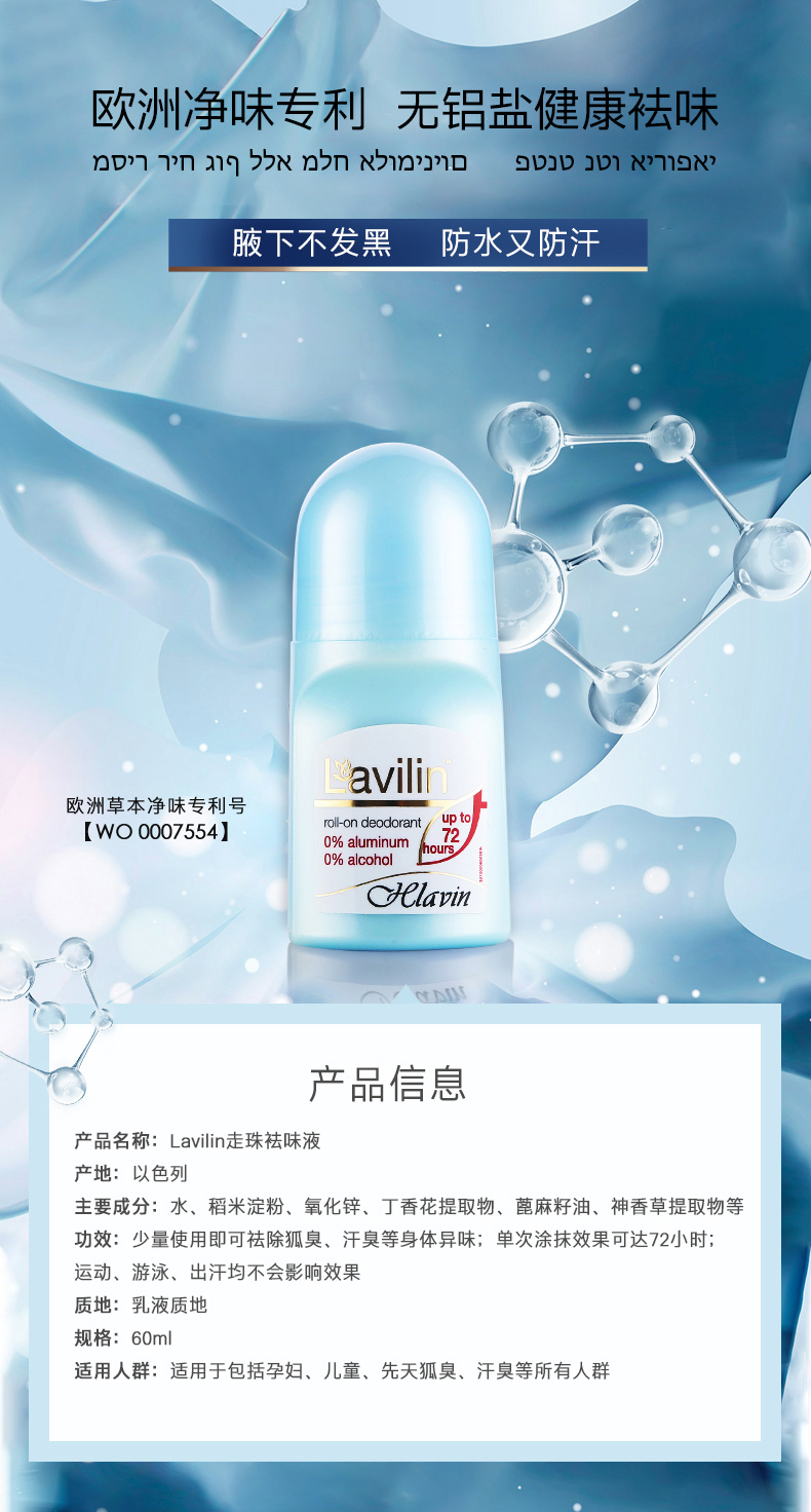 Lavilin是一个专注于身体净味的以色列品牌,已经有了45年历史。旗下的产品拥有两大欧洲除臭专利: