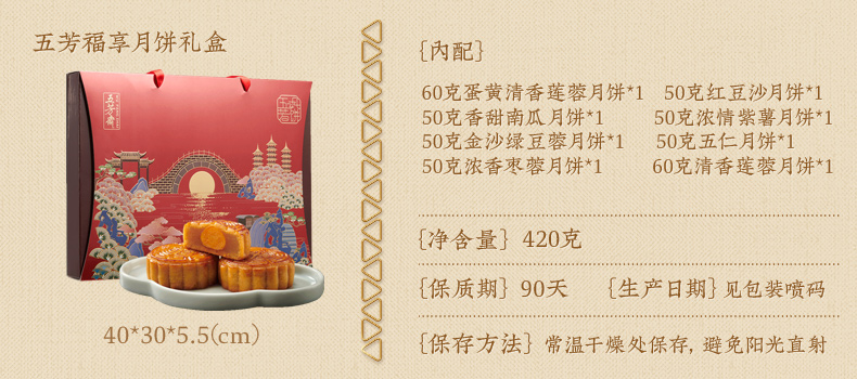 天猫五芳斋官方旗舰店59.9元,下单立减30元,可领10元优惠券,实付19.9元到手,包含蛋黄清香莲蓉、红豆沙、香甜南瓜、浓情紫薯、金沙绿豆蓉、五仁、浓香枣蓉、清香莲蓉8种口味,420g装,带提手的礼盒装,送人也可以。