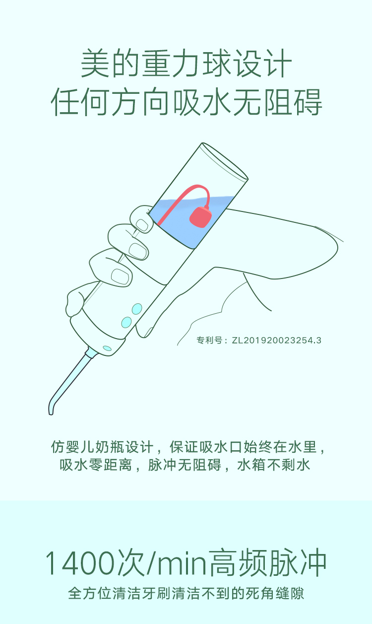天猫美的口腔护理旗舰店409元,可领210元优惠券,实付199元到手,美的冲牙器,伸缩便携款,1400次强劲脉冲,90天持久续航。专利重力球设计,相比普通冲牙器,可以保证吸水口始终在水里,任何方向吸水无障碍,0距离水箱不剩水,避免反复加水,使用更舒适