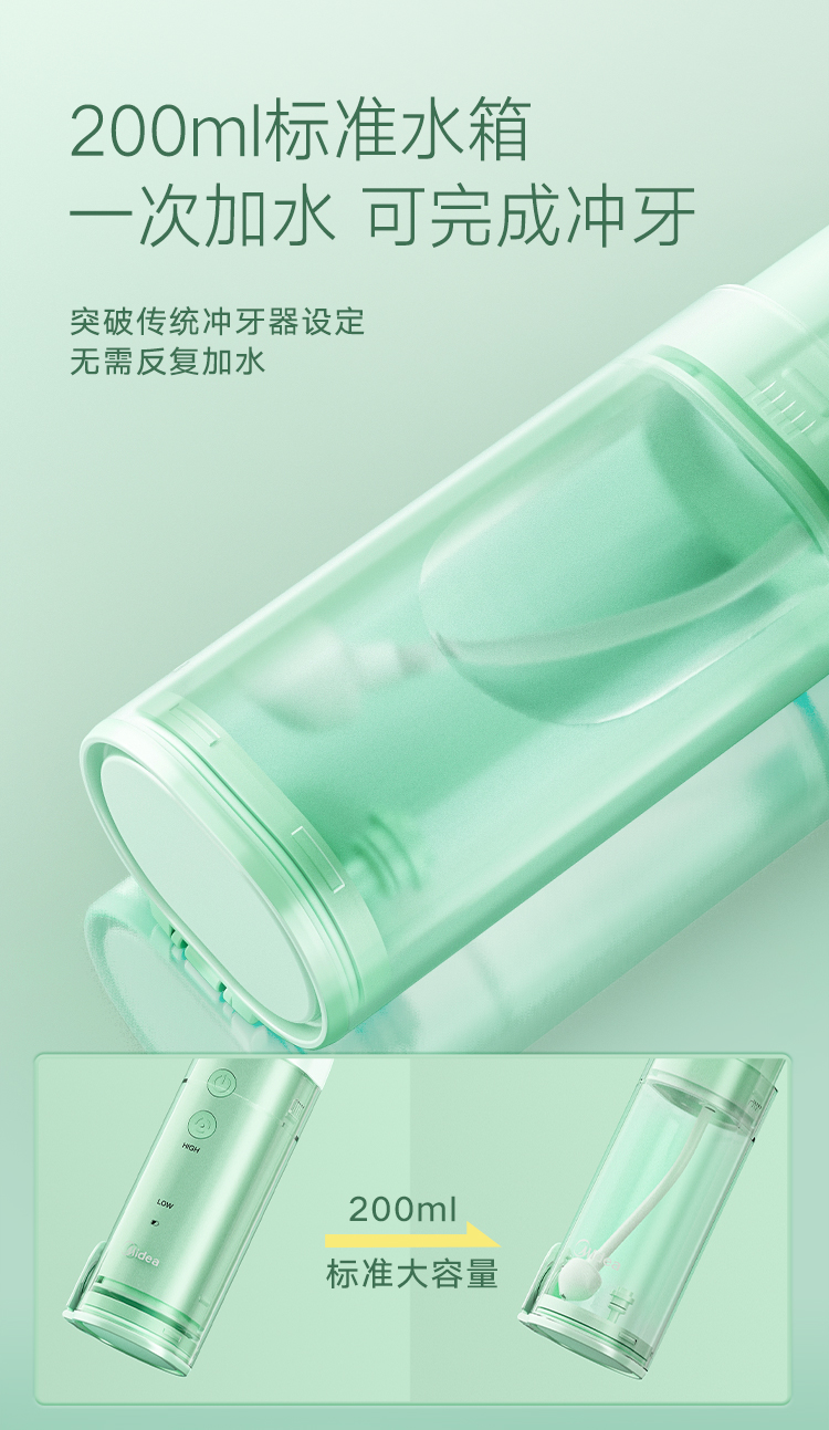 200ml容量可伸缩式水箱,随意变换大小,收纳更便携。水箱可拆卸方便日常清洗,不易滋生细菌。喷嘴随意旋转清洁口腔无死角,360°保护您的口腔健康。