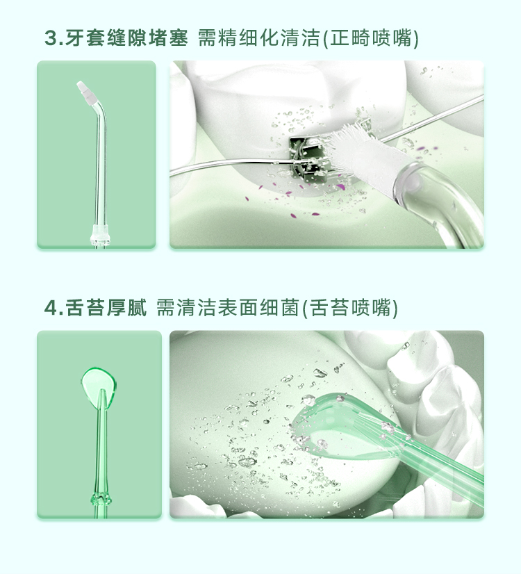 1400次/min高频脉冲,0.6mm细腻水珠,聚焦水流全方位清洁死角死缝,有5种清洁模式,在搭配4种喷嘴,适合不同人群打造专属你的清洁方案。