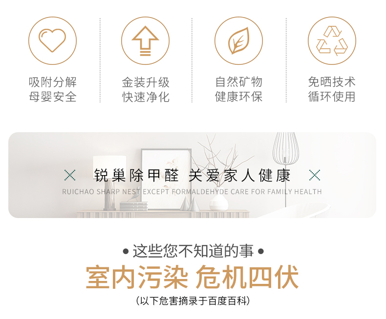这款锐巢活性炭包,可主动锁定空气中的有害气体,碳表面会快速吸附甲醛分子加速甲醛分解,最后分解为二氧化碳和水。有效减少空气的有害气体。也可以放置在汽车内、卫浴等地,吸湿除味,净化空气。