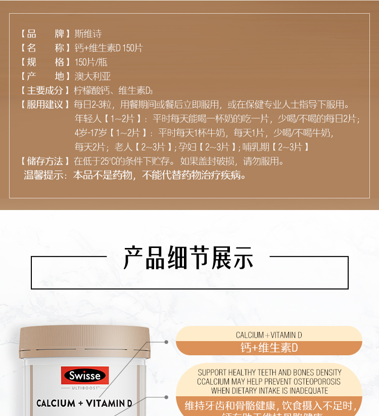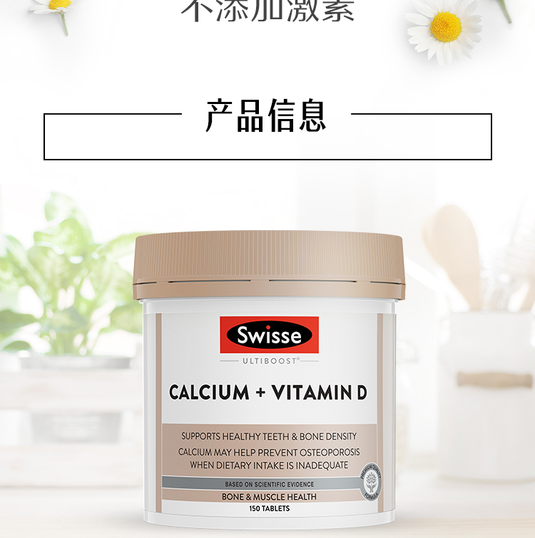 这款钙片含有天然钙和维他命D3,维他命D3协助钙质吸收。能够防治骨质疏松、骨折、腰酸背痛、抽筋、驼背、高血压、失眠、痛经、情绪不稳定等症状,调节心脏节律,有助于维持正常血液凝固,预防儿童佝偻病,成年人软骨症和骨质疏松,对中老年人的身体具有明显改善作用。规格150粒