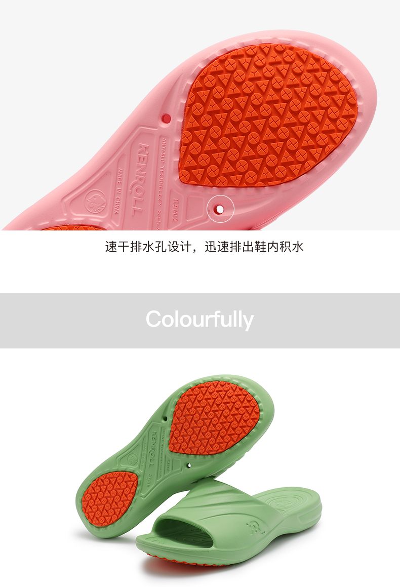 科柔/Kenroll是专注防滑拖鞋的品牌,鞋身使用一体成型EVA材质,鞋床贴合足弓,脚掌带排水孔。科柔的核心卖点是鞋底的防滑贴片,特制橡胶能迅速引导水膜分散,加上三角形和圆形相间防滑纹路,无论是瓷砖、大理石、油污、沐浴露、洗发水地面,防滑效果都足够好。尤其适合老人小孩孕妇穿。