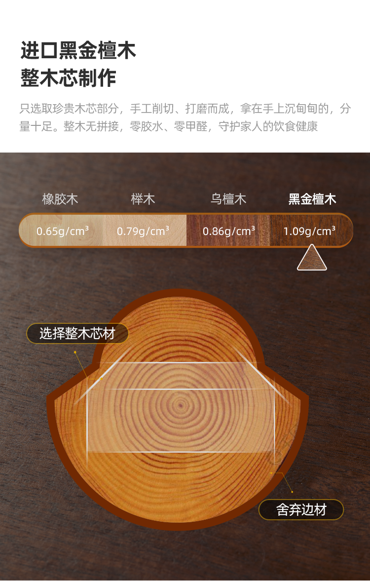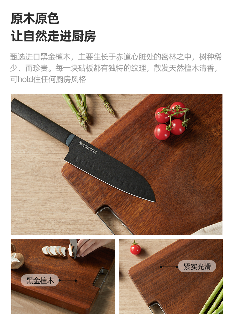 这款淘宝心选的砧板选用南美洲进口的黑金檀木木心制作,硬度高于乌檀木,其结构细腻、纹路均匀、色泽光亮,制成的砧板具有古朴的质感,经久耐用,整木无拼接、无缝隙,所有的配件无螺丝,不易藏污纳垢,易清洗,易打理。