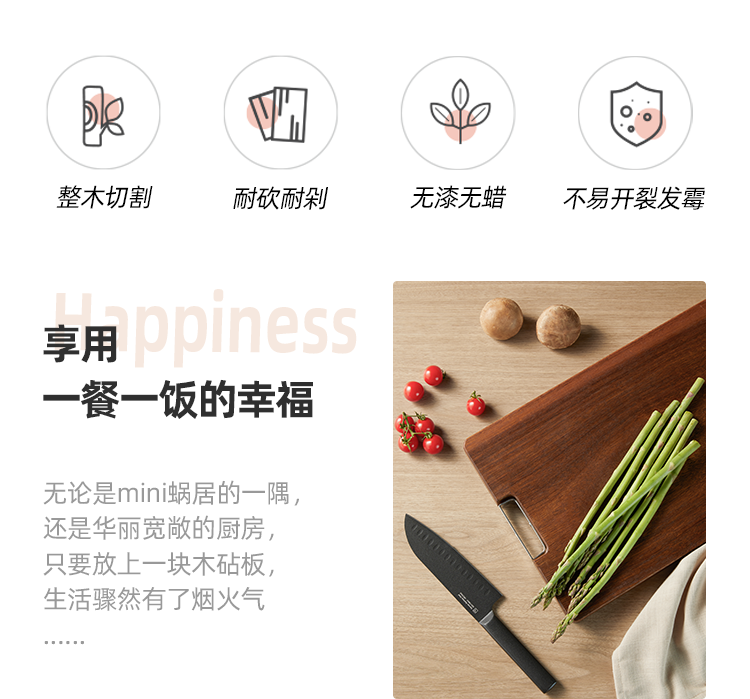 砧板加厚2.8cm,经过高温脱脂烘干技术,将木材的含水率降到8%-12%,使空气中的含水率相平衡,久用不掉色、不开裂、不变形,表面上了一层食品级矿物油,能有效养护砧板。