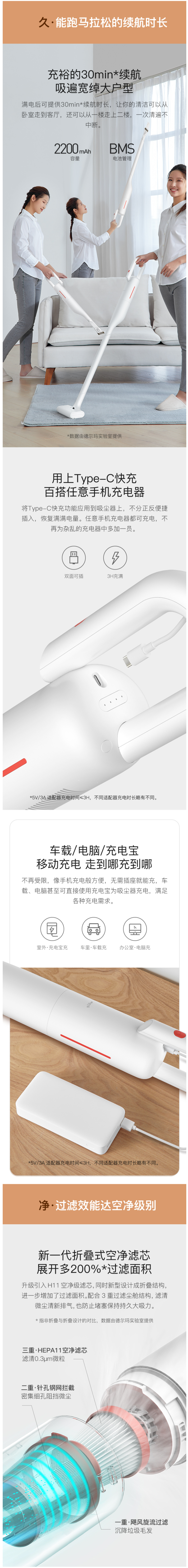 细节上:升级引入H11空净级滤芯,新型折叠结构,展开过滤面积约提升了200%,配合3重过滤尘舱结构,滤清微尘清新排气,也防止堵塞保持持久大吸力。