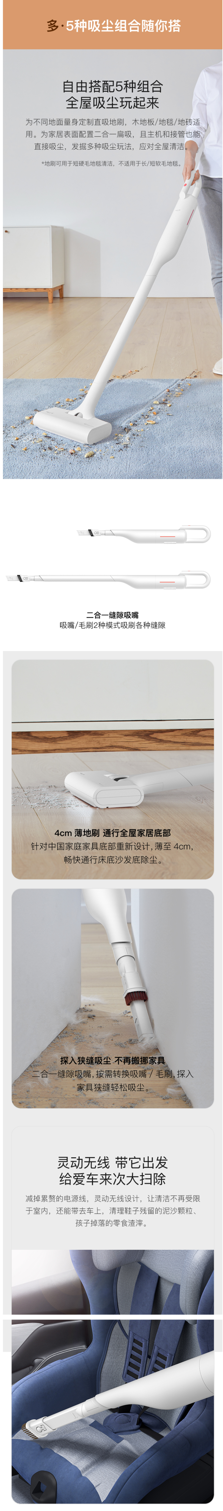 内置性能强悍的迷你电机,带动涡轮风叶瞬速带来高达8500Pa的风压,真空度可达8500Pa,相比上一代吸力提升约50%;实验搭配吸盘测试可轻松提起50斤箱子,配有二合一扁吸头、地刷、内置2200mAh锂电池,满电后能提供30分钟续航,无线使用更灵动,车载、电脑、充电宝可直接为其充电,非常方便。