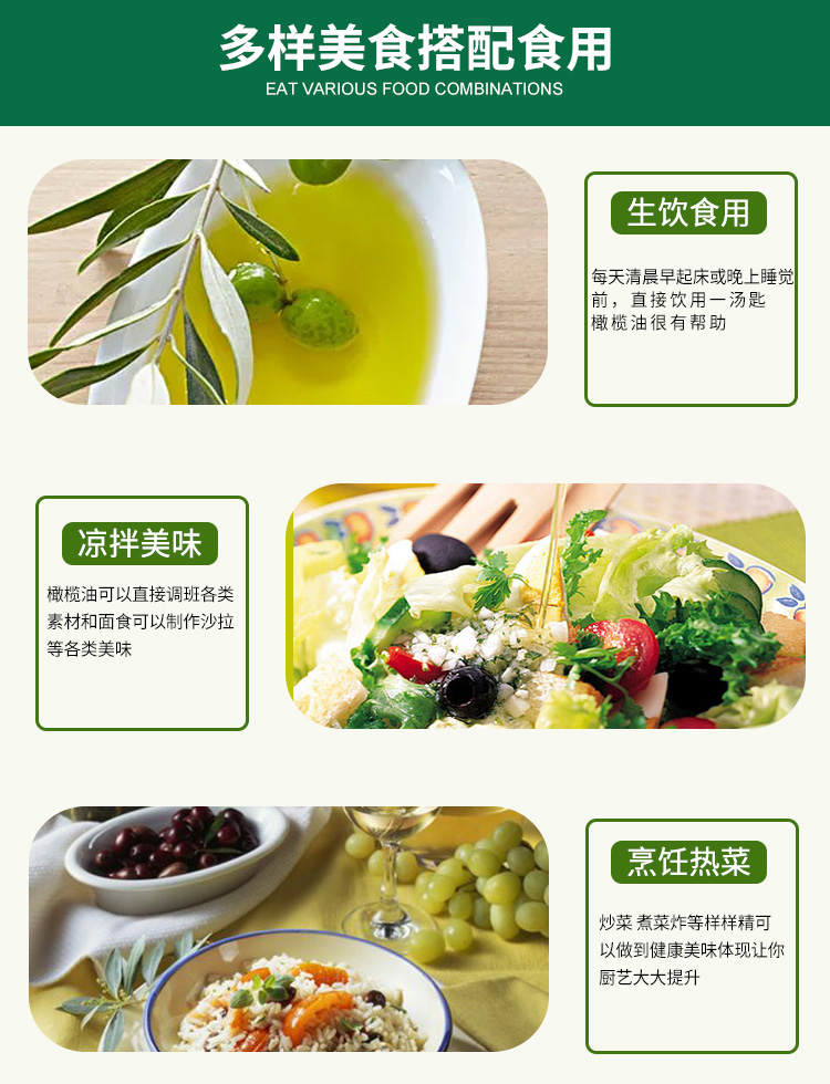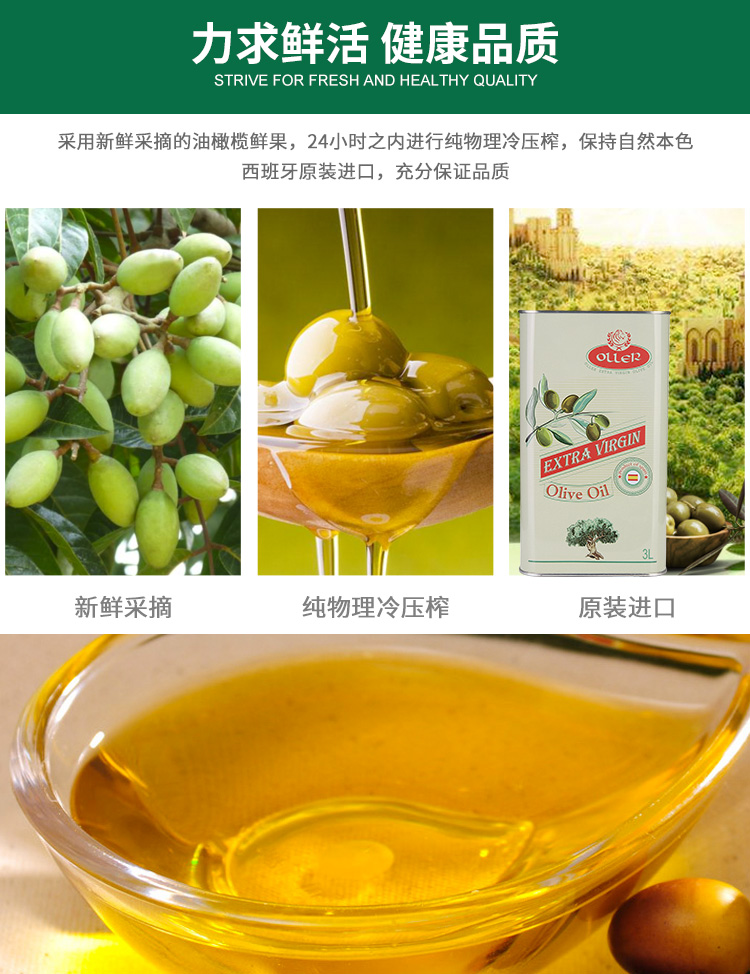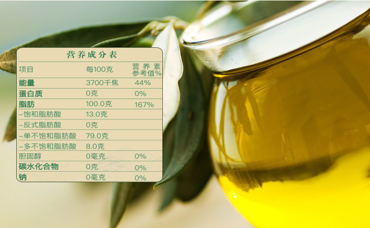 橄榄油在地中海沿岸国家有几千年的历史,在西方被誉为“液体黄金”,“植物油皇后”,“地中海甘露”,原因就在于其极佳的天然保健功效,美容功效和理想的烹调用途。可供食用的高档橄榄油是用初熟或成熟的油橄榄鲜果通过物理冷压榨工艺提取的天然果油汁,是世界上唯一以自然状态的形式供人类食用的木本植物油。