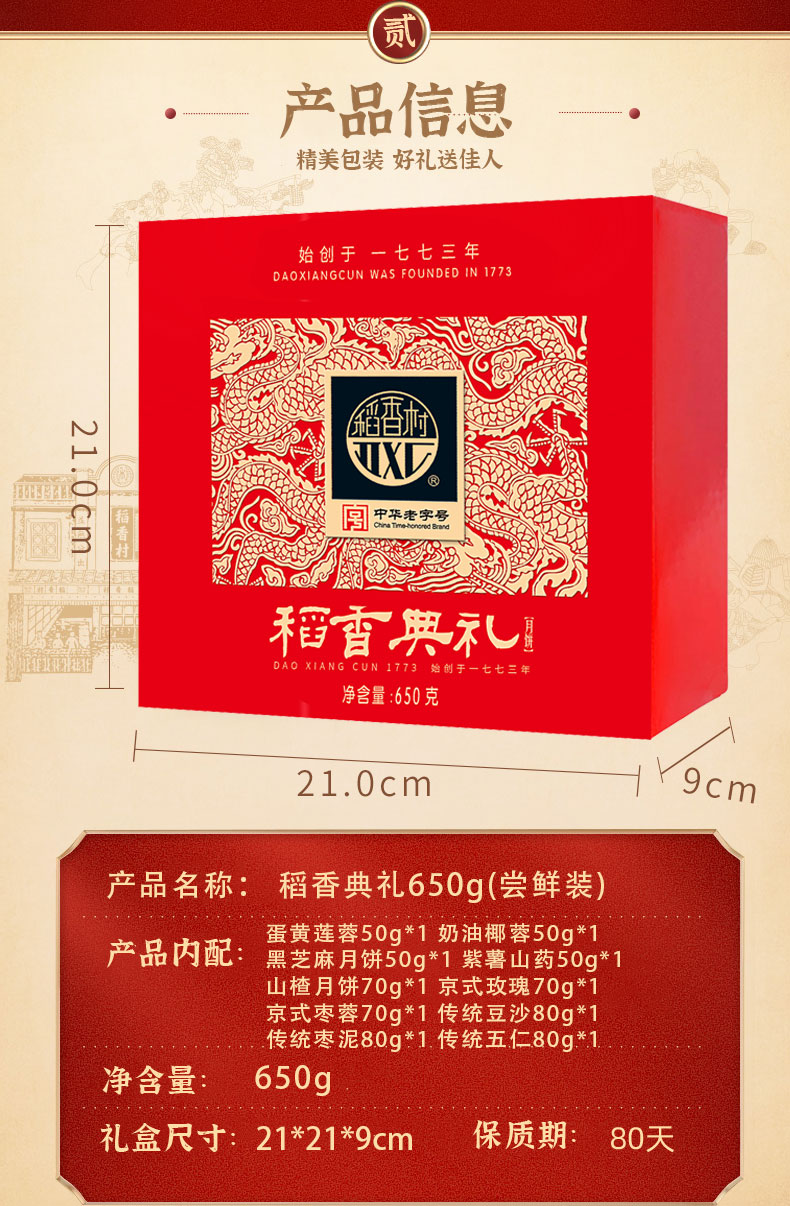 简装礼盒,10饼10味 包含:蛋黄莲蓉50g、奶油椰蓉50g、黑芝麻月饼50g、紫薯山药50g、山楂月饼70g、京式玫瑰70g、京式枣蓉70g、传统豆沙80g、传统枣泥80g、传统五仁80g、