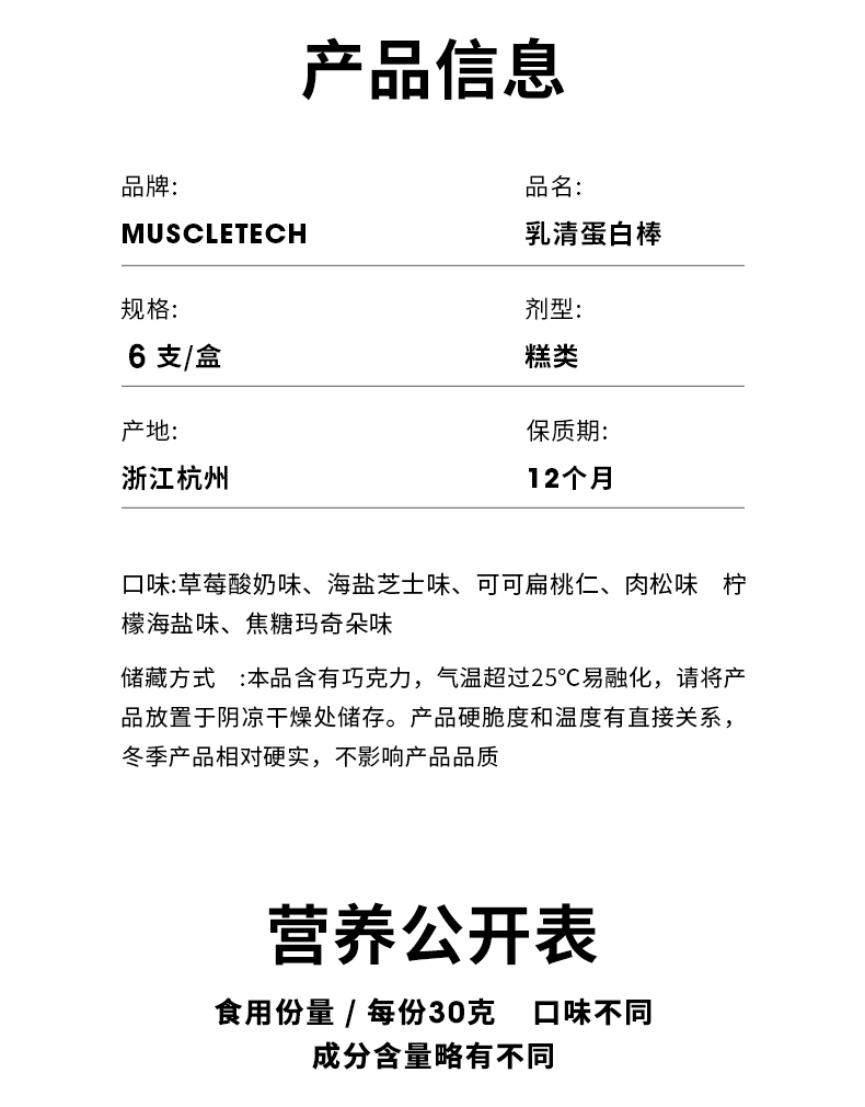 这款Muscletech 肌肉科技 乳清蛋白棒,规格: 30g*6支,5重高蛋白,含量高达30%,强化健康力,解馋解压零食,快速补充能量,动植物双蛋白双重健康力,一口补进8种人体必需氨基酸,且蛋白消化率高达98%,营养高倍吸收,健康有活力。0反式脂肪,甜度来自低热值代糖,一支热量相当于一根香蕉。高蛋白新增膳食纤维,脂肪及碳水比重合理,一支30g,集营养+充能+抗饿于一身。