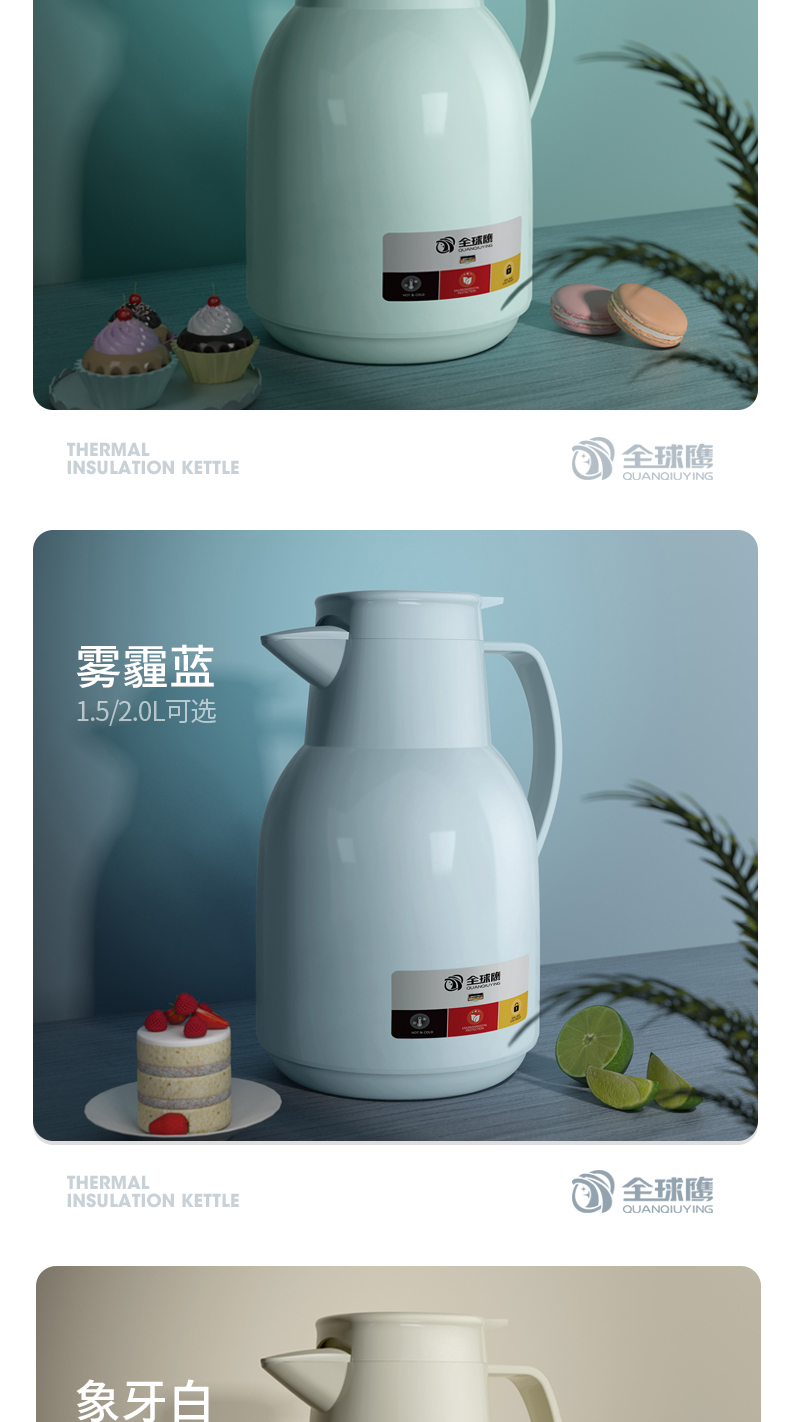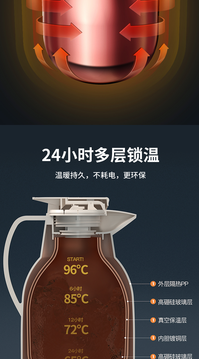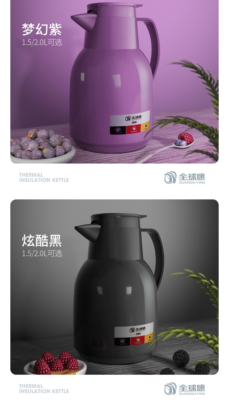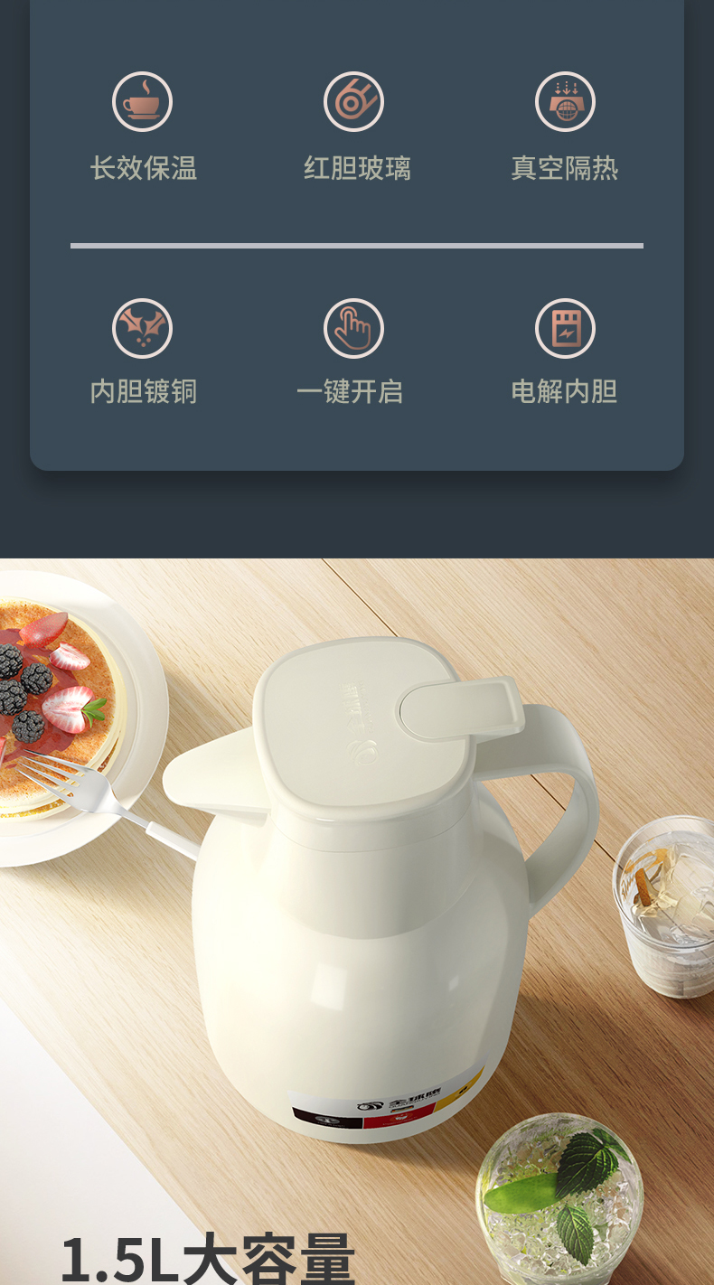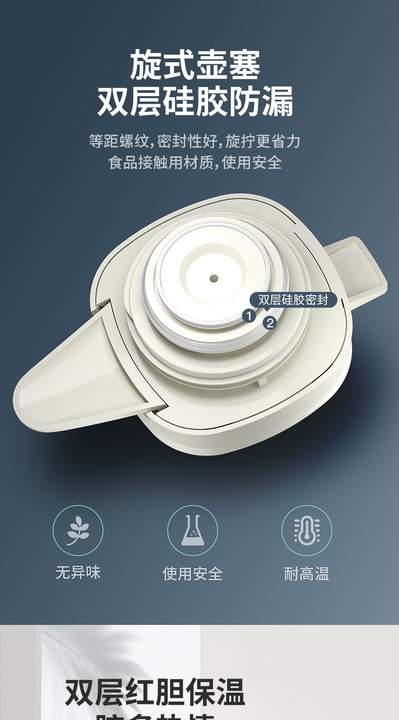 细节上:壶嘴仿鸟喙设计,倒水均匀,密封防尘防溢水,一键出水轻松操作,旋式壶塞双层硅胶防漏,耐高温,无异味,保温存鲜长效48小时,有14种种颜色可选,满足居家不同装修风格。