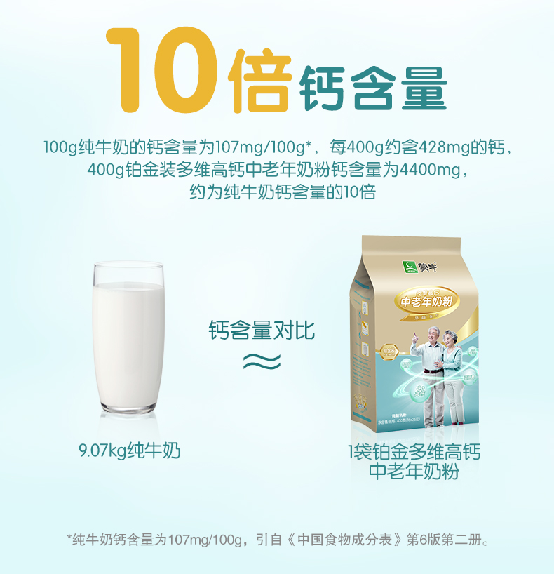 这款蒙牛 铂金 中老年高钙配方奶粉,是专门为中老年人群设计,将低聚木糖(XOS)、乳双歧杆菌、钙、铁、亚油酸等成分科学配比组合而成,补充中老年人所需的营养,独立小条装,冲饮时个很方便,规格是25g*16条。