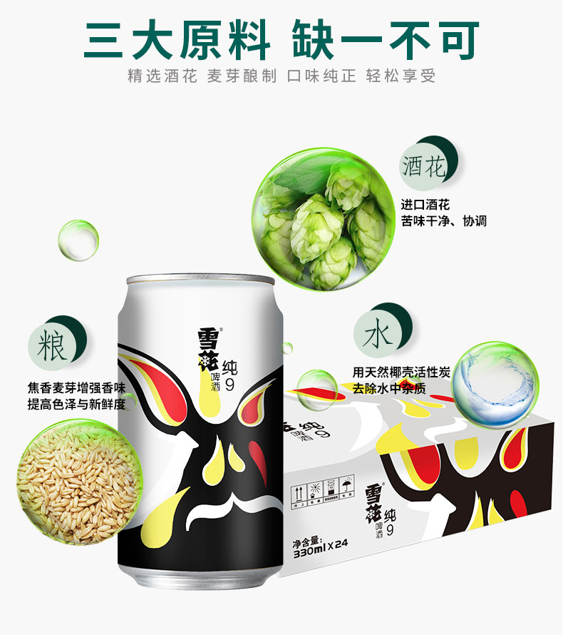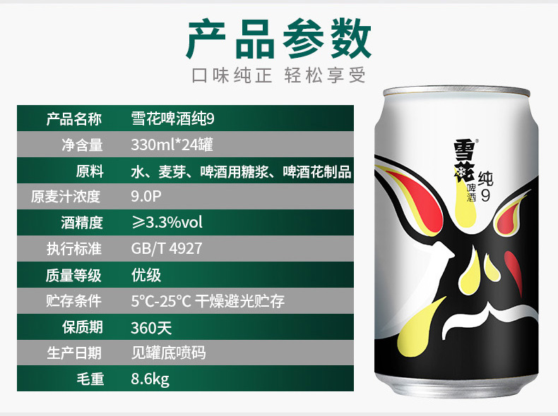 这款雪花 9度 纯9啤酒,优选小麦、水、啤酒花匠心工艺酿造,质量等级优级,国粹京剧脸谱易拉罐设计,潮流涌现,每一口都是鲜爽,夏季聚餐必备!