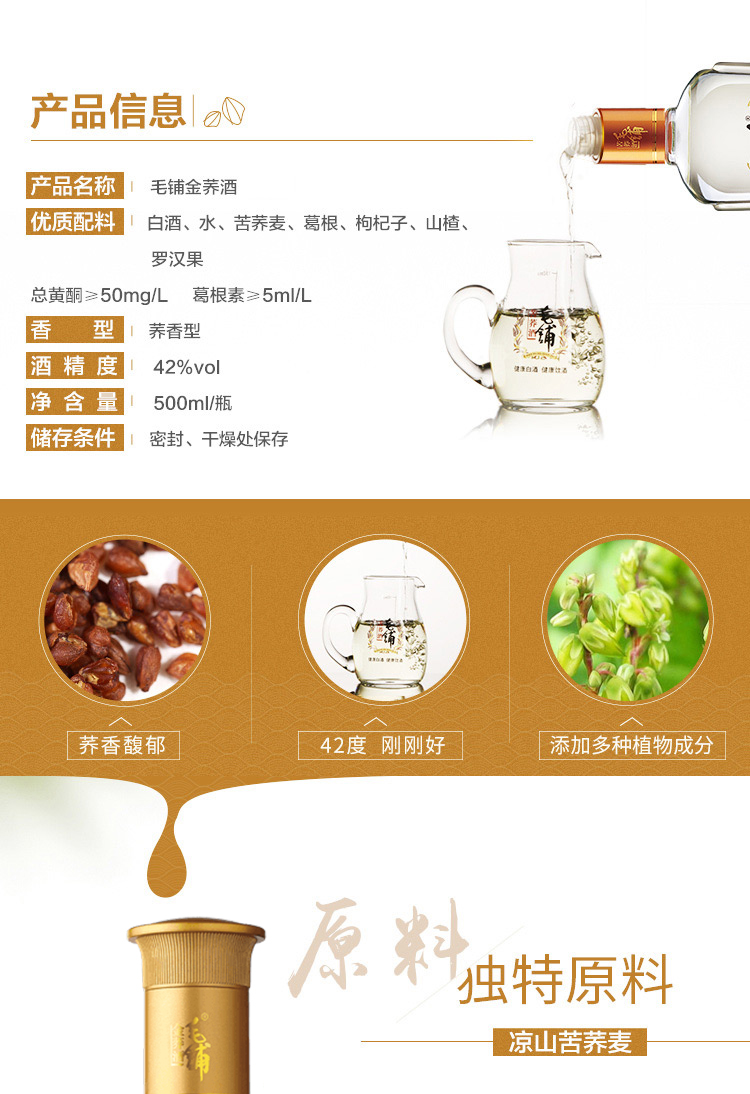 这款毛铺金荞是其中高端的苦荞酒,选用优质苦荞酿造,苦荞集七大营养素于一身,被誉为“五谷,三降食品”,是自然界甚少的药食两用作物,多种植在海拔1200-3500米的高寒山区。在造型和外观都融入了苦荞元素,自饮送礼均合适。