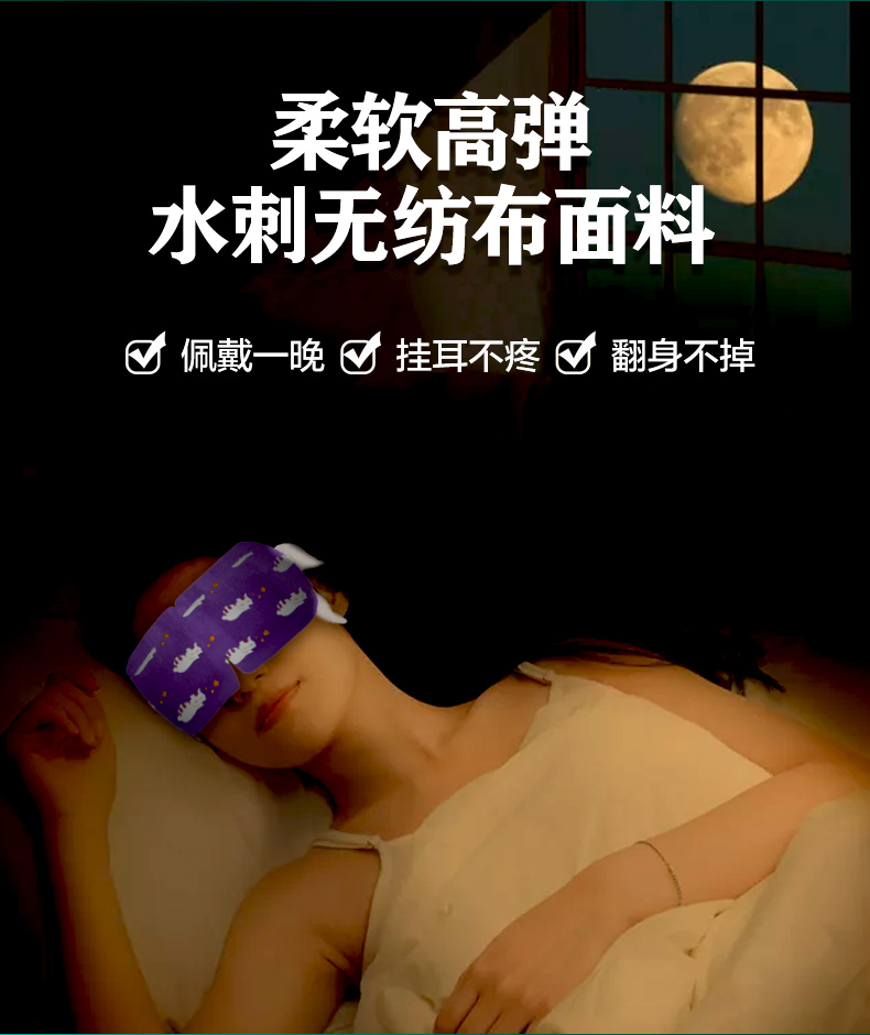 罩体是柔软高弹的水刺无纺布面料,亲肤安全无毒,内置1mm发热片,对眼部无压感,挂耳不疼,翻身不掉