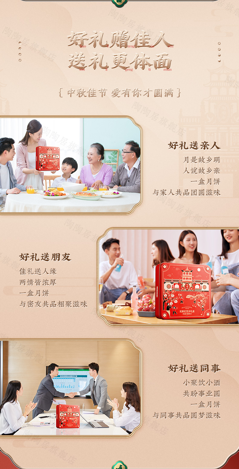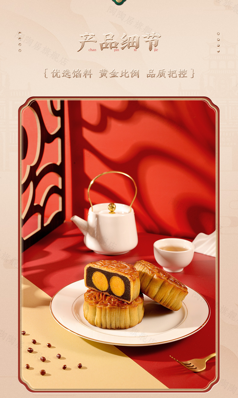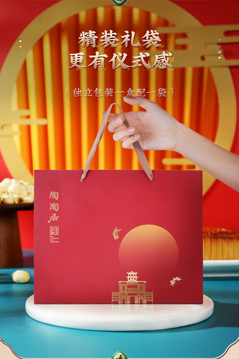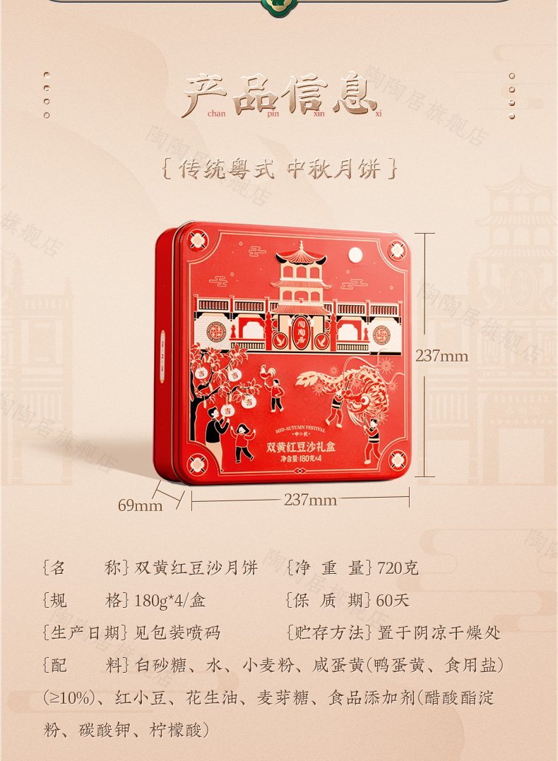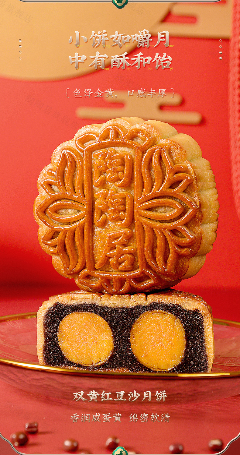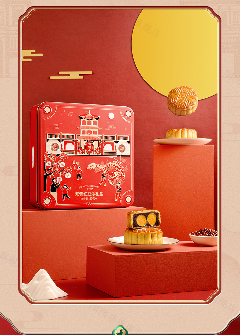 这款陶陶居 双星映月双黄白莲蓉月饼礼盒,精选细选好食材、优良原料、份量足,选用农家鸭蛋,外酥里嫩,精选优质大豆油,现在工艺精炼而成;水洗红豆沙,细腻无渣,甜而不腻,唇齿留香,香醇嫩滑,皮薄馅足。规格:180g*4块。