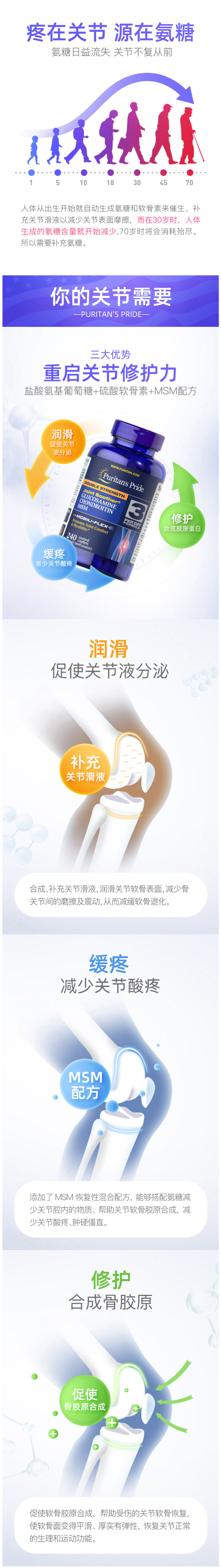 这款普丽普莱氨糖维骨力,美国原装进口,3倍高浓度配方,作用于全身关节,催生关节滑液,缓解疼痛感,促进软骨生长,持续养护延缓关节老化。还特别添加了MSM止痛成分,减少了关节的疼痛,预防感染、加速愈合。