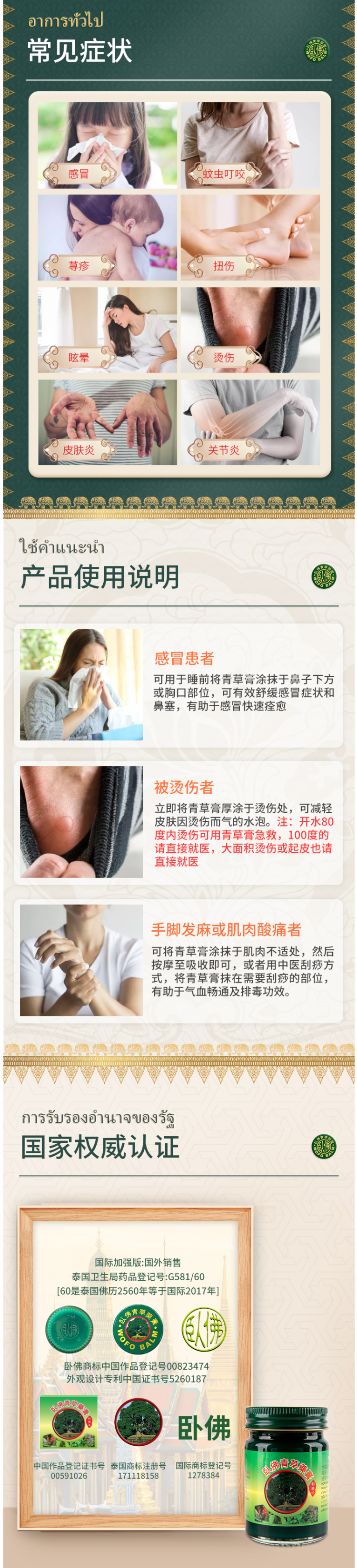 这款卧佛 加强版青草药膏,在泰国是属于万金油般的存在,主要成分是薄荷、樟脑、药草油,能驱蚊止痒、舒缓酸痛、提神醒脑、化瘀消肿、防晕车晕船,气味清香不刺鼻。