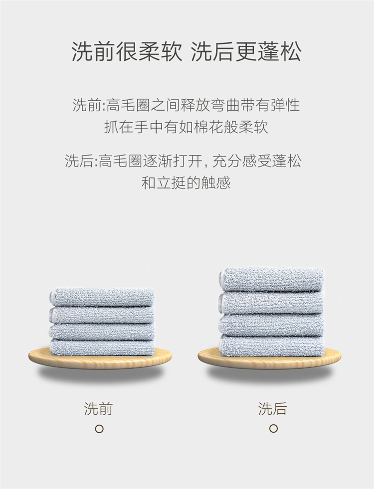 洗前高毛圈之间释放弯曲带有弹性,抓在手中有如棉花般柔软;洗后高毛圈逐渐打开,充分感受蓬松和立挺的触感,特殊加捻工艺,久用不发硬。色牢度可达4级,稳定性好,不用担心混和洗涤,掉色颜色问题。