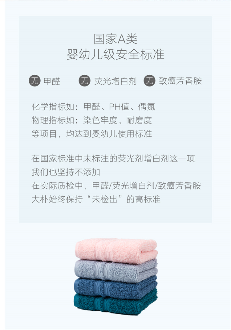 =49元 到手价,毛巾尺寸34*74cm,单条克重150g,差不多是市面普通毛巾的2条重量了,毛巾厚实轻柔,吸水力强,使用舒适。国家婴儿级A类安全标准,无甲醛、无荧光增白剂、无致癌芳香胺,使用放心。