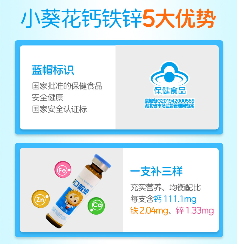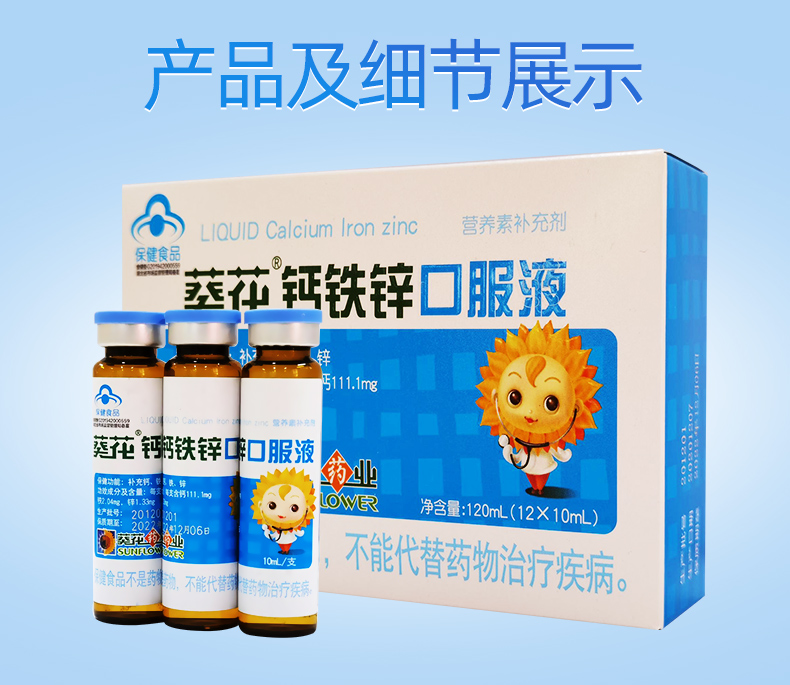 葵花品牌,线下药店都有卖,钙铁锌口服液儿童成长补钙,宝宝葡萄糖酸钙锌口溶液,一支补钙铁锌三样,每支含钙111.1mg、铁2.04mg、锌1.33mg液体钙易吸收。液体钙溶解度好,钙离子更易被吸收。适合儿童、孕妇、乳母等补充营养。旗舰店发货,品质靠谱。