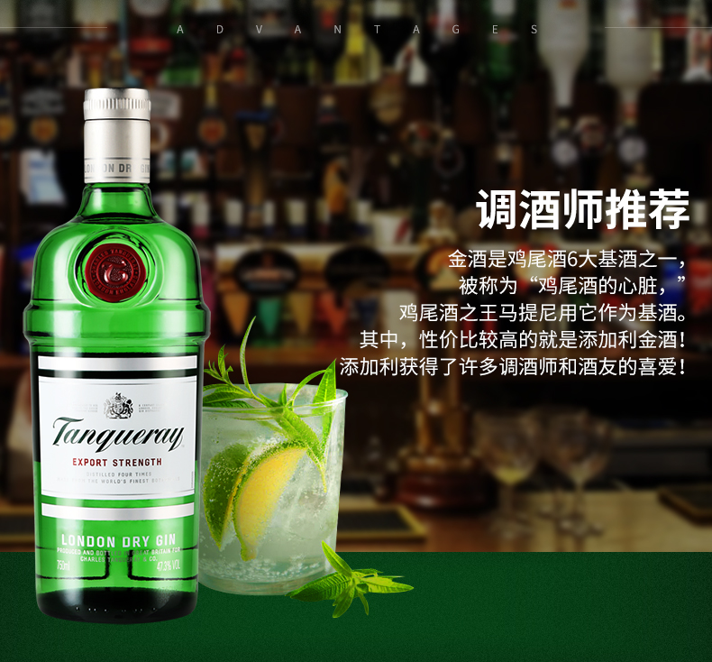 金酒又名叫杜松子酒(geneva)或琴酒,是世界第一大类的烈酒。Tanqueray 添加利属英式干金酒,由添加利哥顿公司生产,深厚甘冽,具独特的杜松子及其他香草配料的香味,是进口金酒的第一品牌。