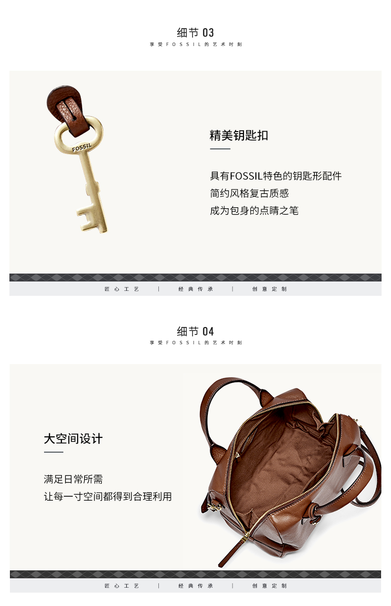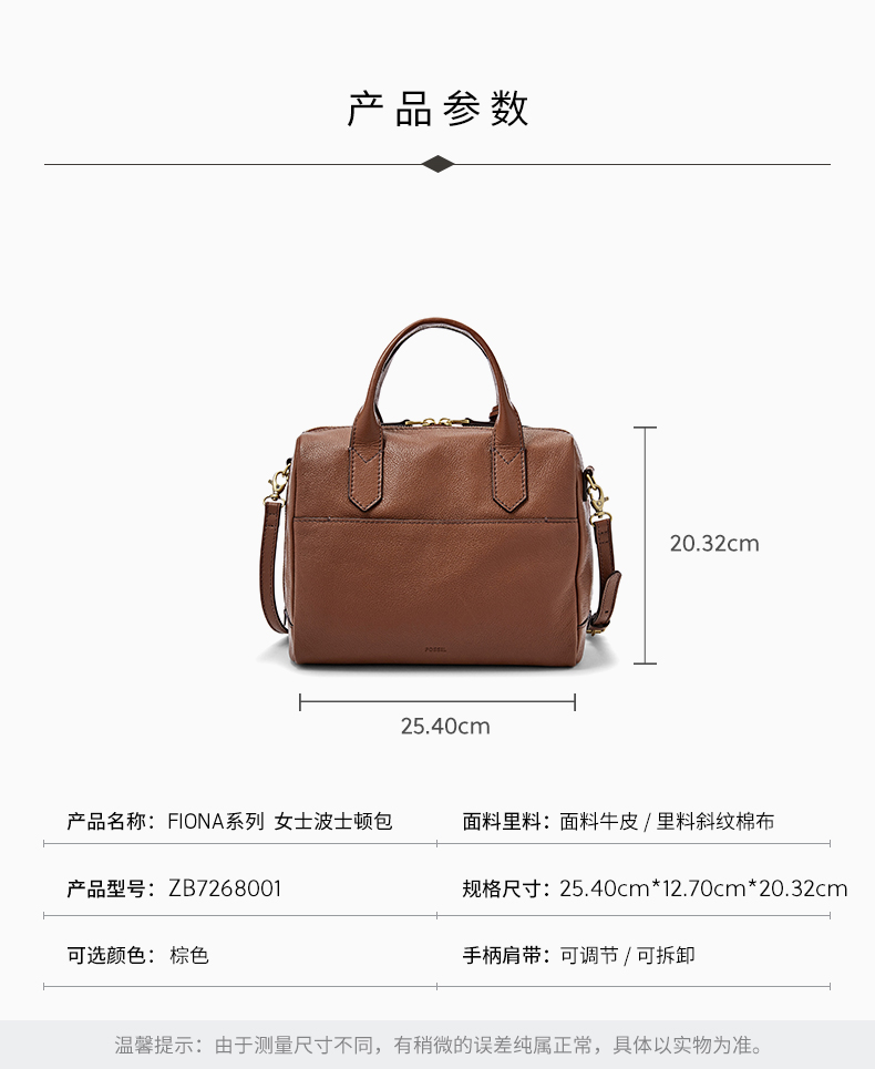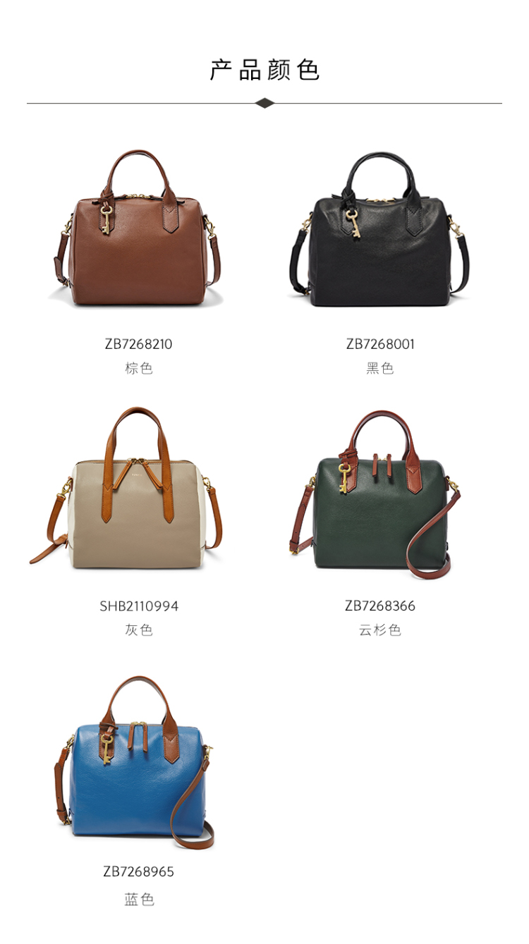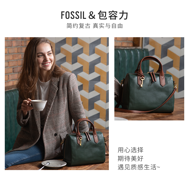 这款化石Fossil女士真皮波士顿包,属于FIONA系列,可手提也可单肩或斜跨,包身使用纯牛皮制成,纹理清晰,摸起来的手感很细腻。复古简约设计,特点就是包内空间大,尺寸是25.4*12.7*20.32cm。