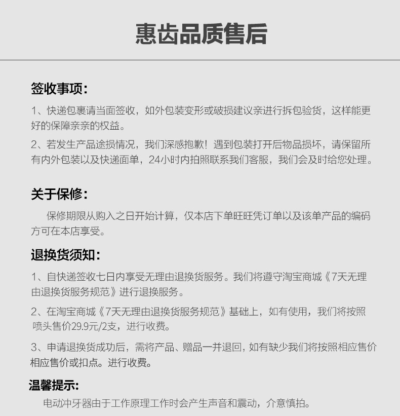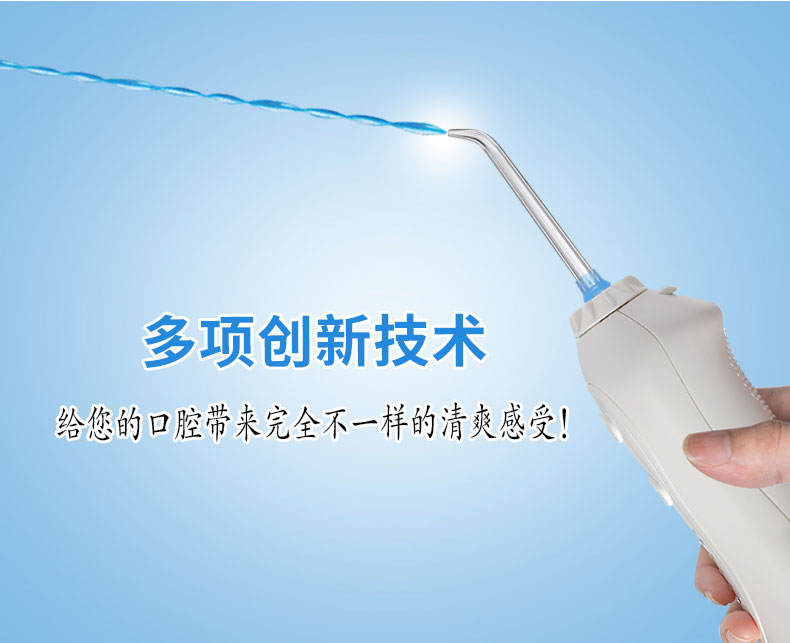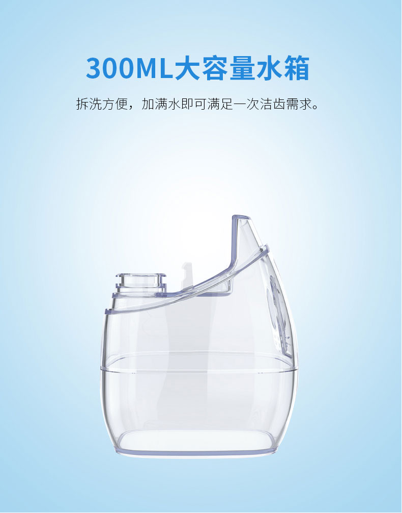 全面升级,日本万宝至马达,可拆卸式水箱,重力球设计,多角度使用,用水无残留。配有标准喷嘴*2、正畸喷嘴*1、牙周袋喷嘴*1、舌刮喷嘴*1.