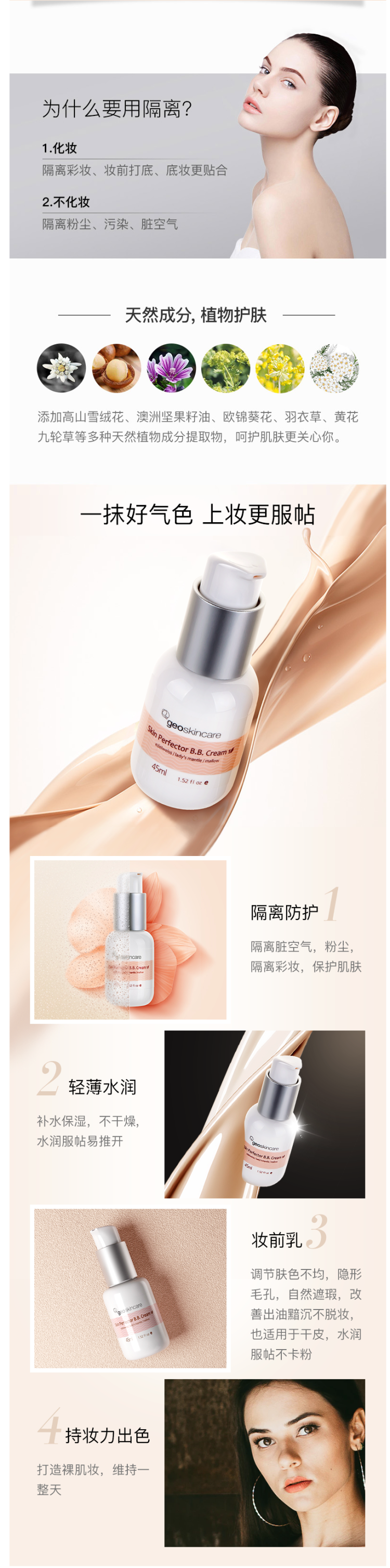 含欧洲坚果油,隔离的同时提亮肌肤,均匀肤色,添加高山雪绒花、澳洲坚果籽油、欧锦葵花、羽衣草、黄花九轮草等多种天然植物成份提取物,呵护肌肤,水润服贴,适合所有肌肤,尤其适用于干燥、粗糙、毛孔粗大、暗沉不均等肌肤。