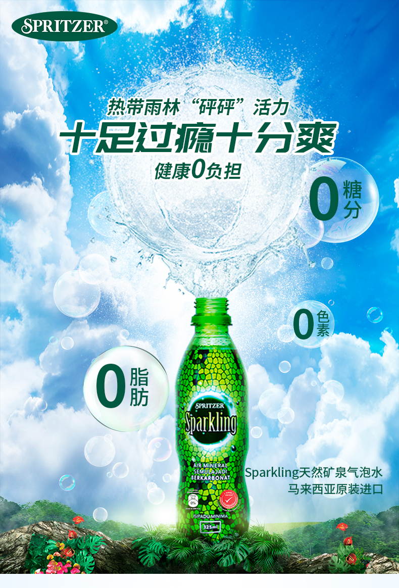 spritzer的水源地是来自马来西亚热带原始雨林。雨林生态保存完好,泉水是天然矿物质弱碱性水,据说是两亿年无人踏足的地方,水质天然纯净,远离工业污染。富含水溶性偏硅酸,可以直接被身体吸收利用,每100毫升 含偏硅酸 75,钙 37.67、镁 3.36,钾 2.71、钠 9.41,规格: 325ml*24瓶