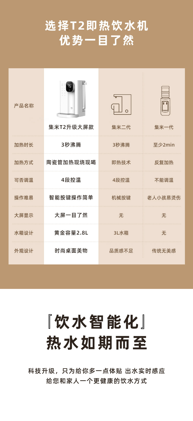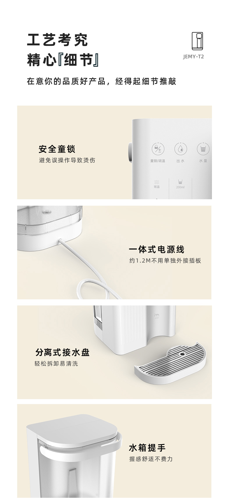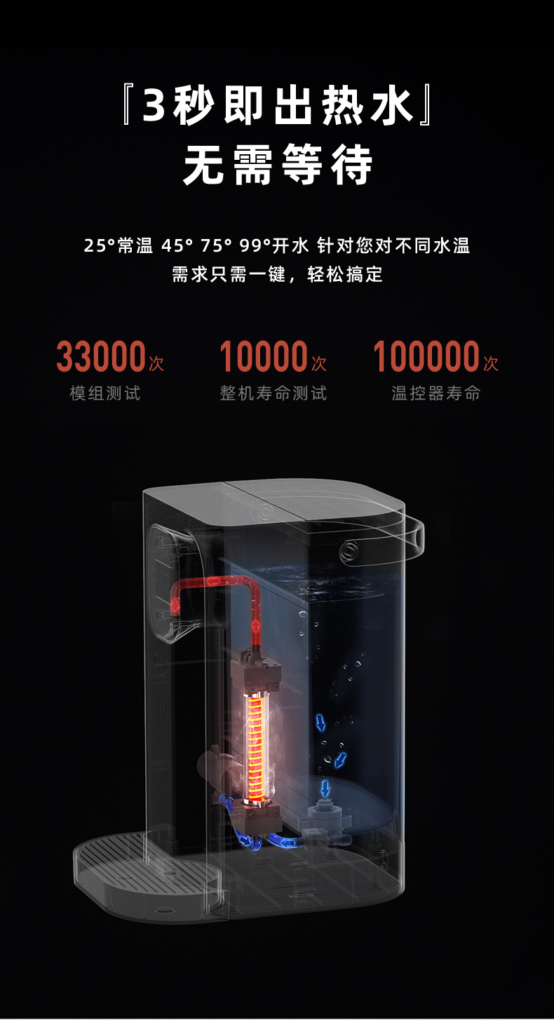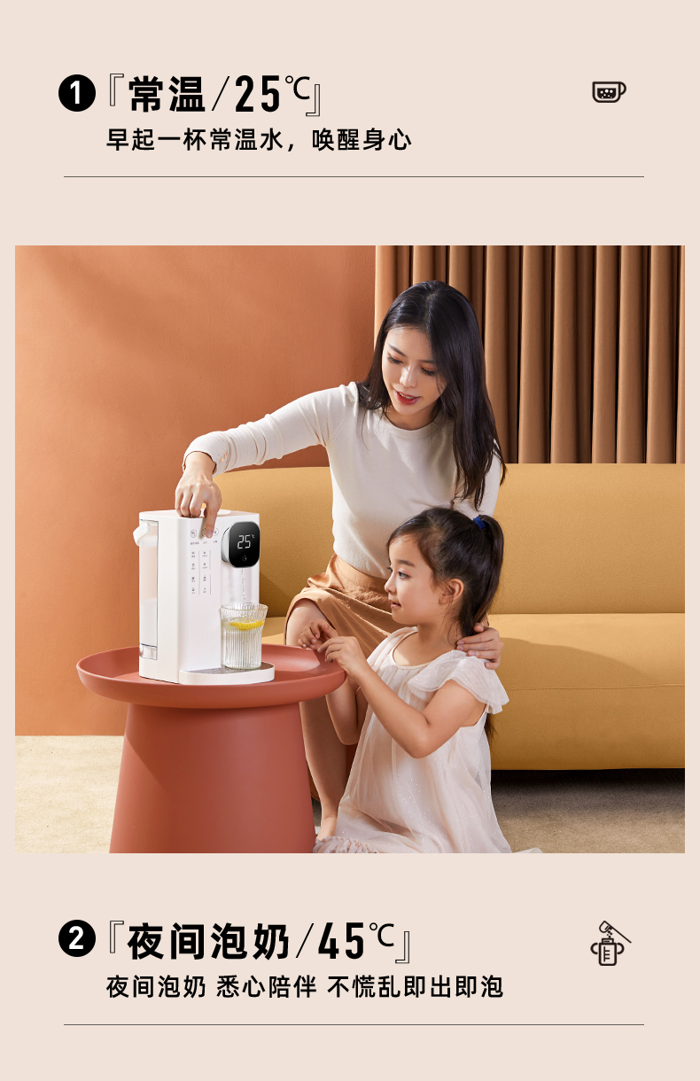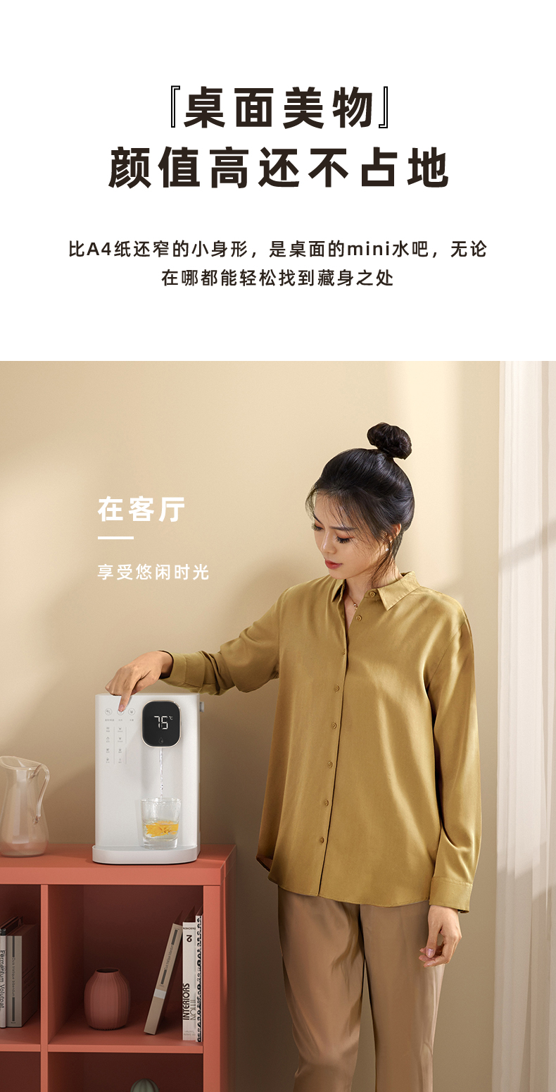 集米即热饮水吧,1秒即热,现烧现喝新鲜热水。拥有4档水温可选,LED智能显示,泡茶、泡奶粉、泡蜂蜜均可以找到适宜的温度。迷你机身,方便移动,满足厨房,卧室,浴室不同场景需求,磁吸式接水盘,使用方便。