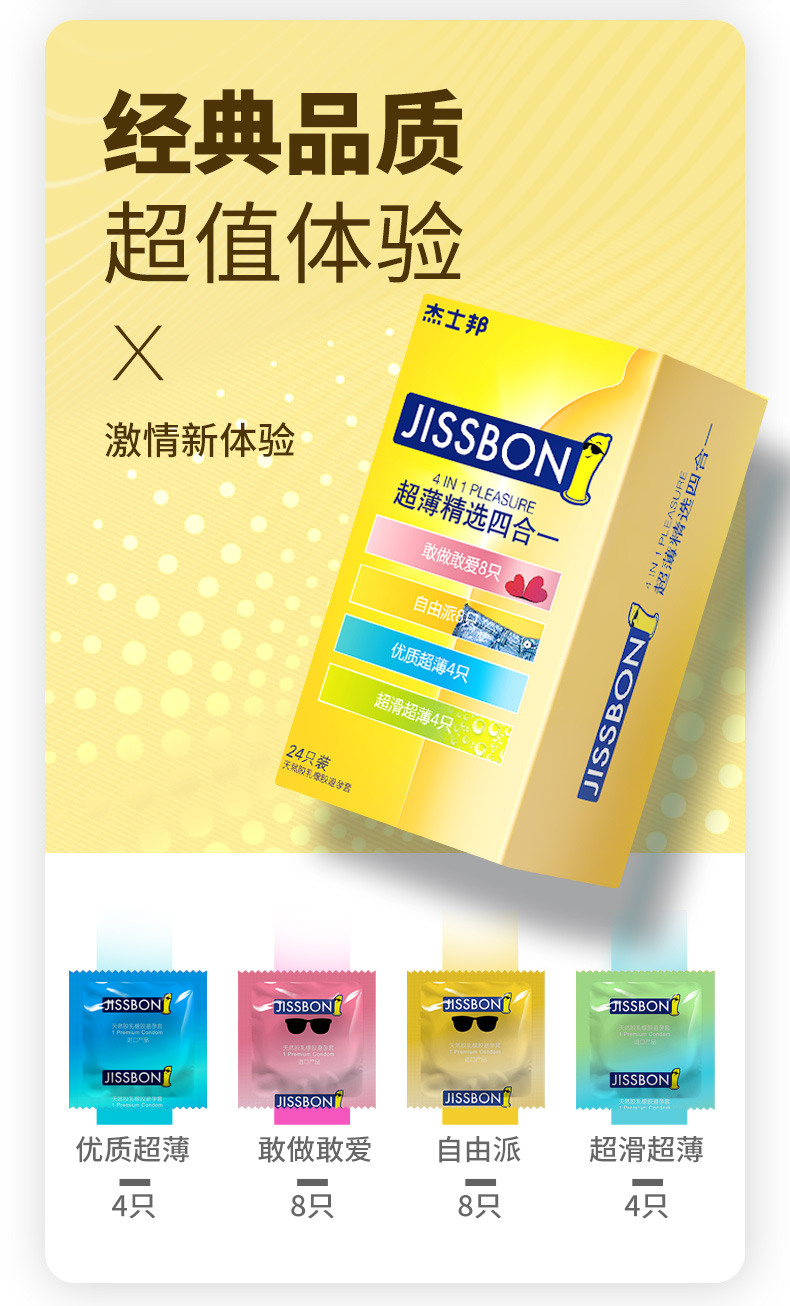 阿里健康大药房,倒数第3款34只售价199元,可领180元优惠券,实付19元到手,这款套装款属于杰士邦品牌超薄系列的活动产品,单件包含:超薄精选四合一24只+三合一6只+超薄沁润4只。采用进口天然乳胶,添加有适量医用水润润滑剂,无香型,带有储精囊。保密发货,品质靠谱