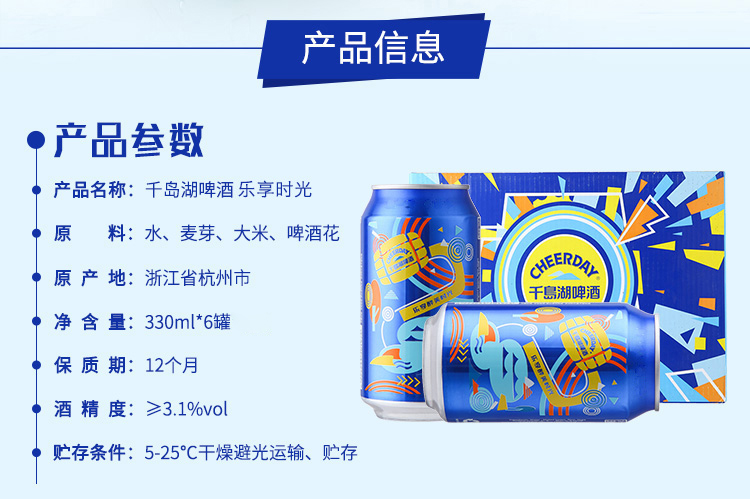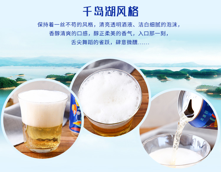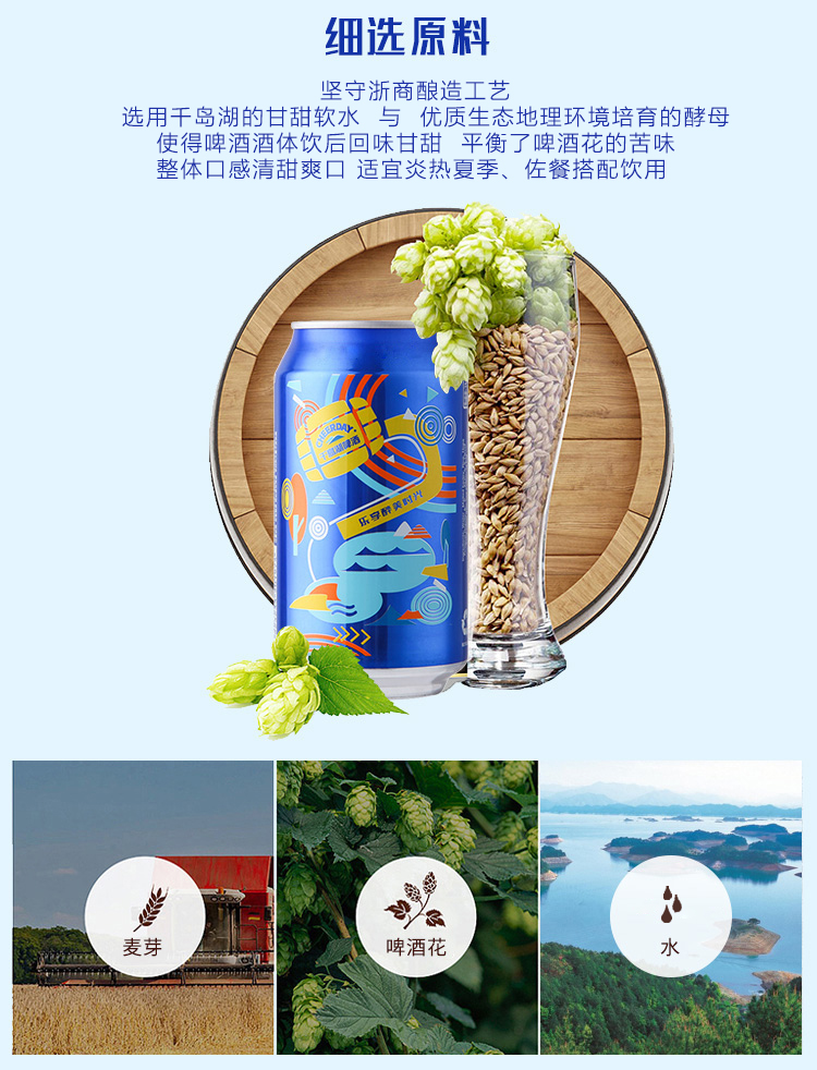 甄选千岛湖的甘甜软水、优质酵母、麦芽、大米为原料,啤酒饮后回味甘甜、平衡了啤酒花的苦味,整体口感清甜爽口,适宜炎热夏季、佐餐搭配饮用。
