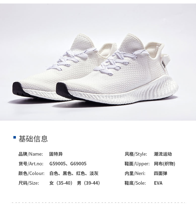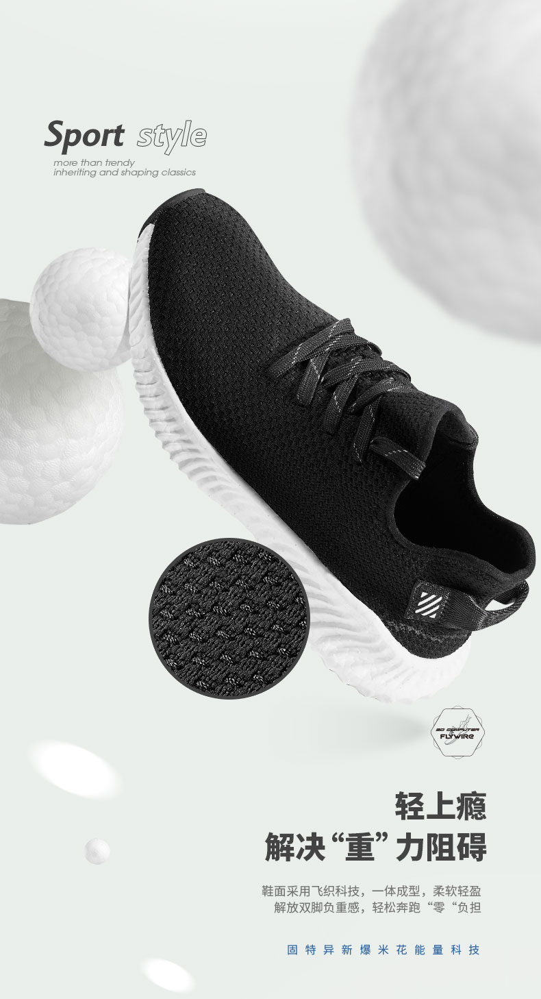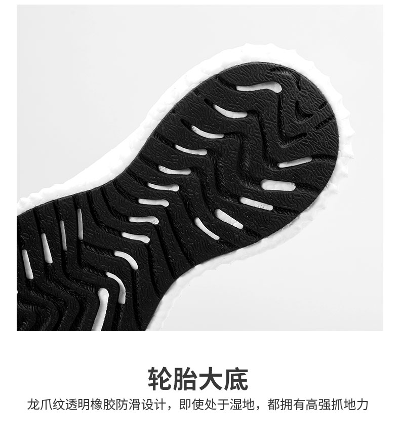 弹性飞织呼吸网2.0鞋面,透气不捂脚。脚感舒适轻便柔软,轮胎时尚花纹防滑耐磨,鞋底线条优美,潮流大屁股后跟,幅度立体感强。