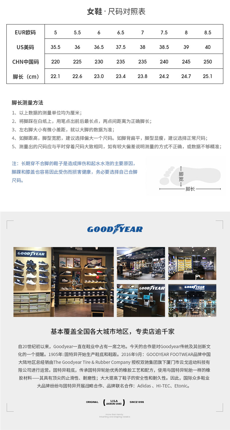 1905年固特异开始做鞋,因为鞋底做的和轮胎一样好,防滑、耐磨、安全耐久,广受好评。2016年9月GOOD YEAR品牌中国大陆地区总经销授权厦门一家公司进行经营,2017年6月10日,固特异中国第一家鞋品店于北京王府井正式开业,现在专卖店超过1000家。
