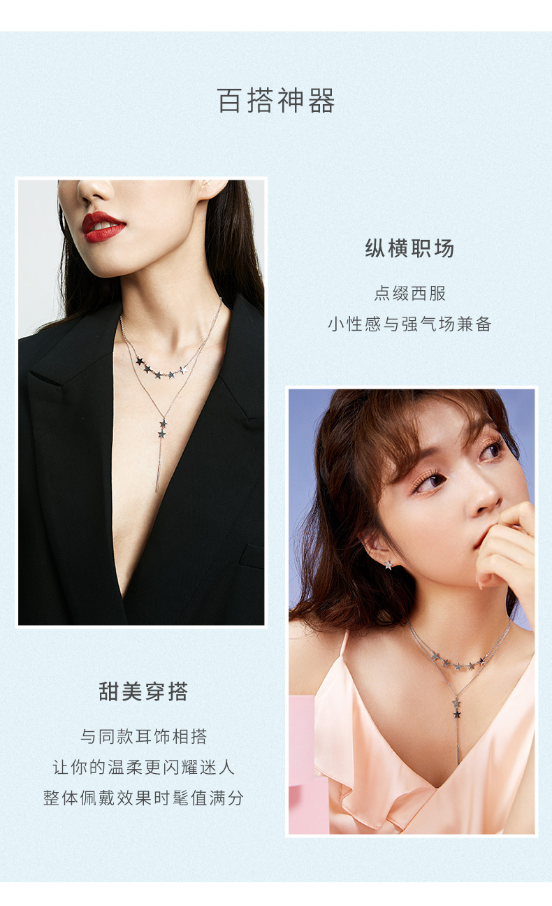 这款周大生 双层叠戴星星项链,是一款S925纯银锁骨链,双层叠戴的繁星满天设计,搭配长链吊坠,散发着青春活力少女范。主体是925银材质,对皮肤无刺激。