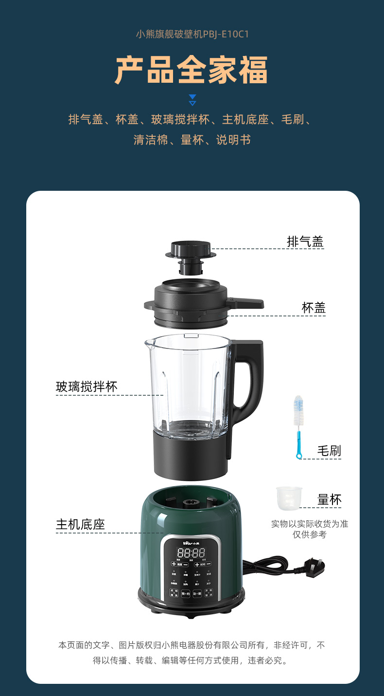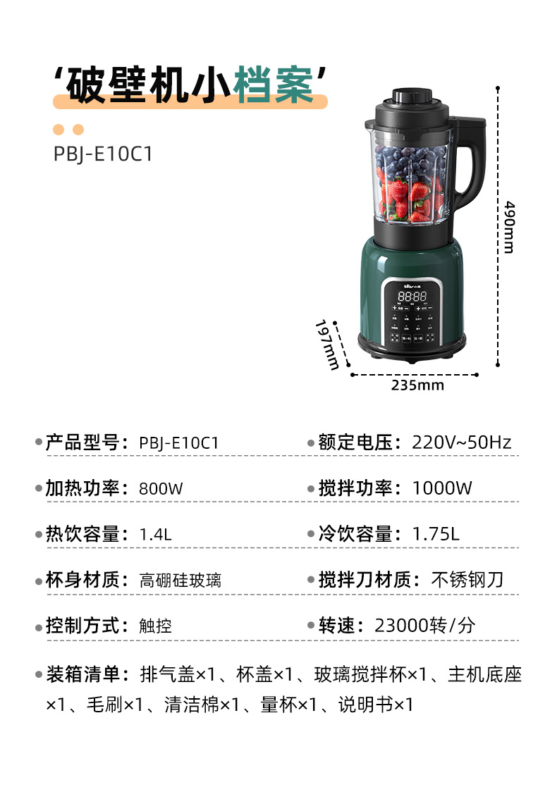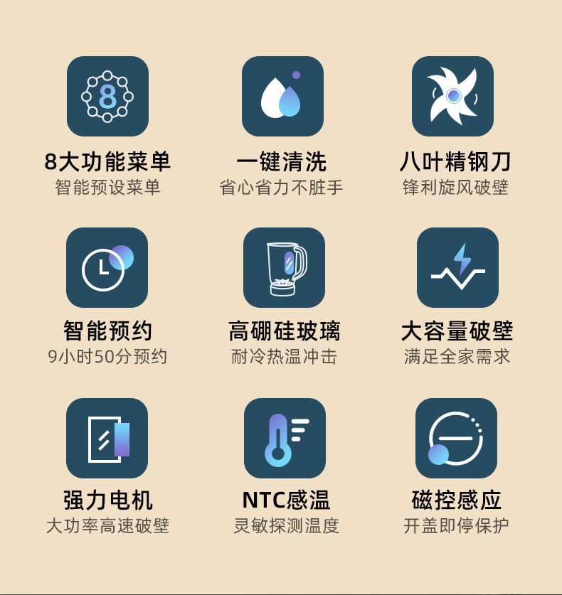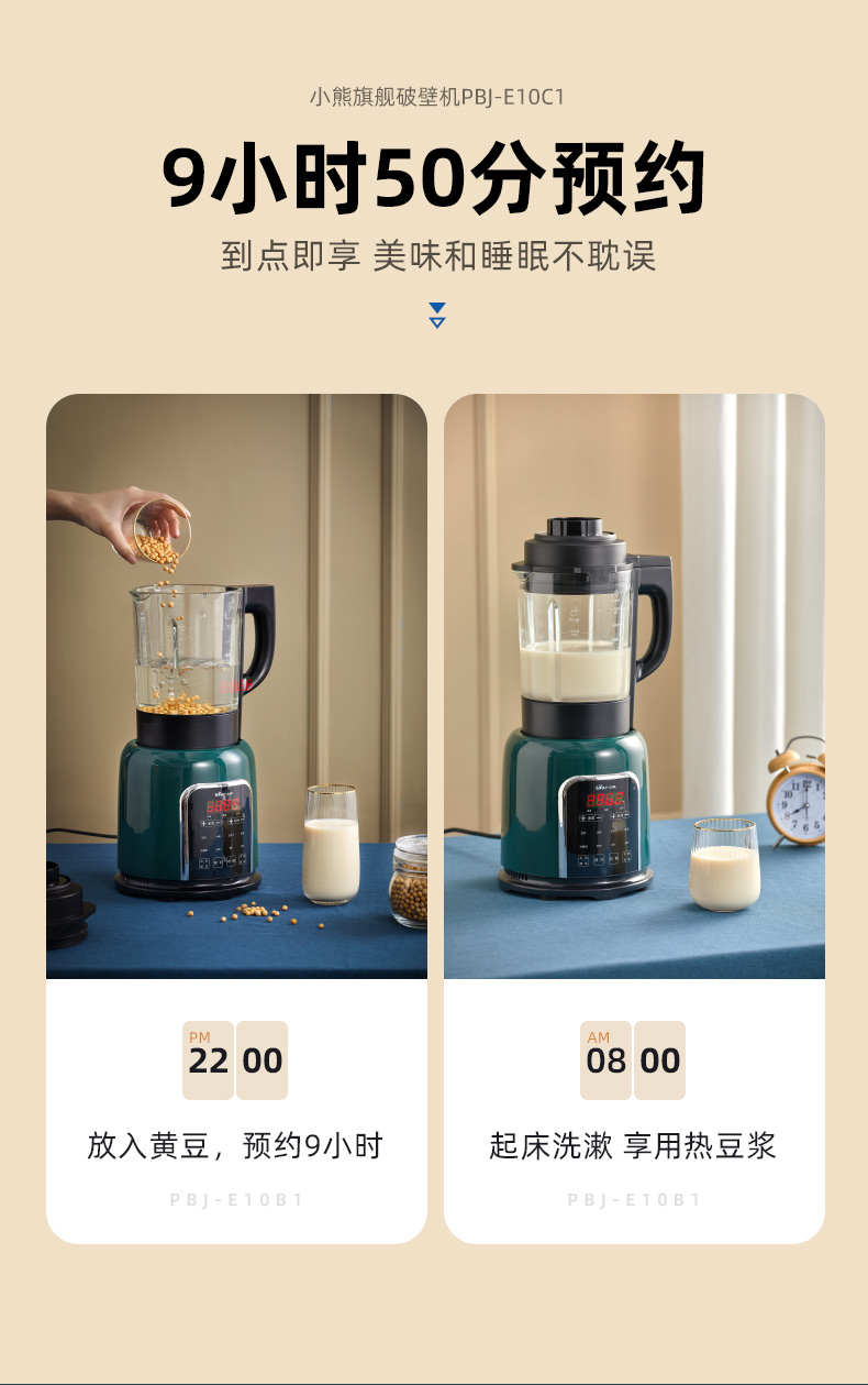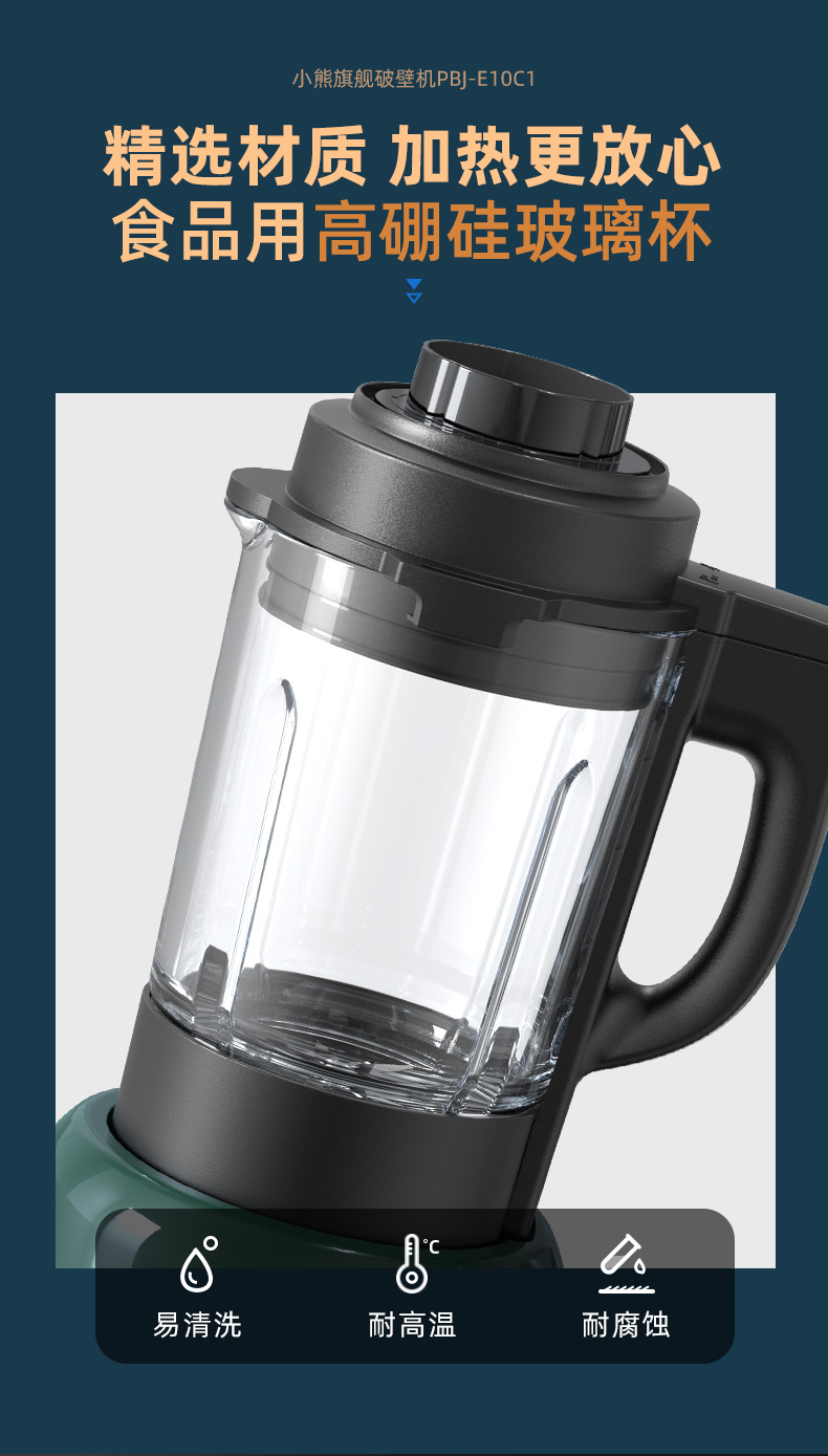 搅拌杯是加厚高硼硅玻璃制成,结构更牢固不易碎,耐高温骤冷骤热不易炸裂,可冷热双打。智能操作界面,带19小时50分小时提前预约功能,可在睡前提前放入食材,第2天早起即可享用。