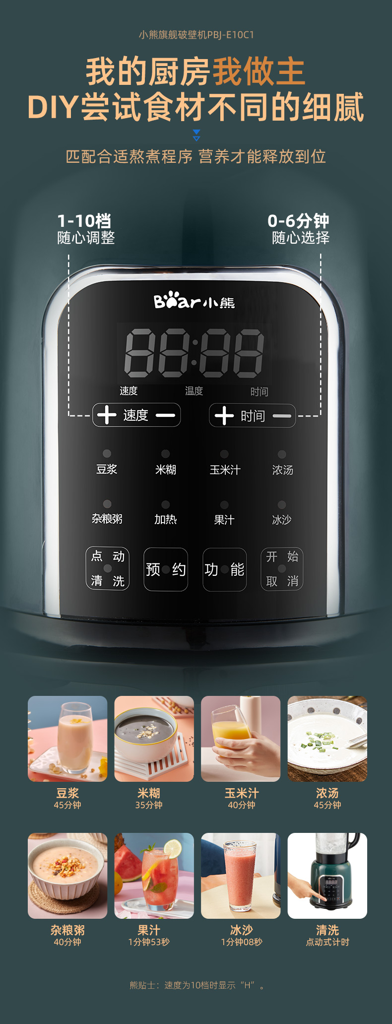 配合熬煮程序,速度1-10档,时间0-6分钟可随意调节