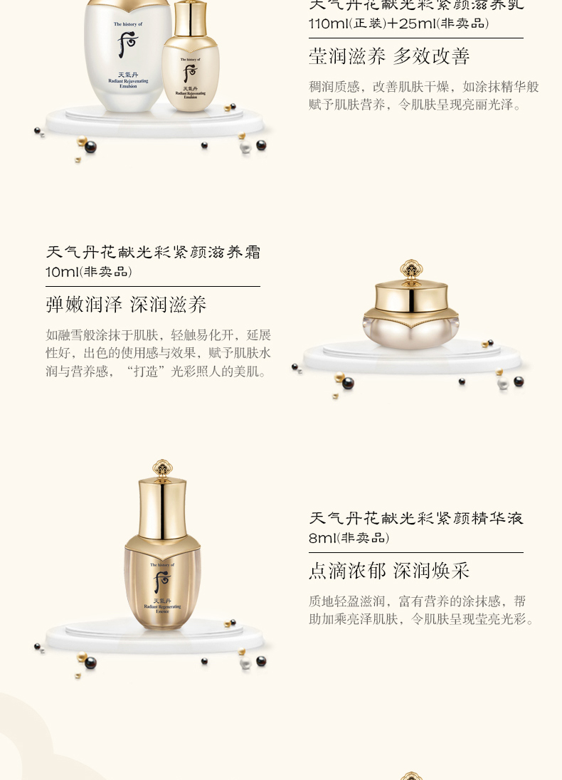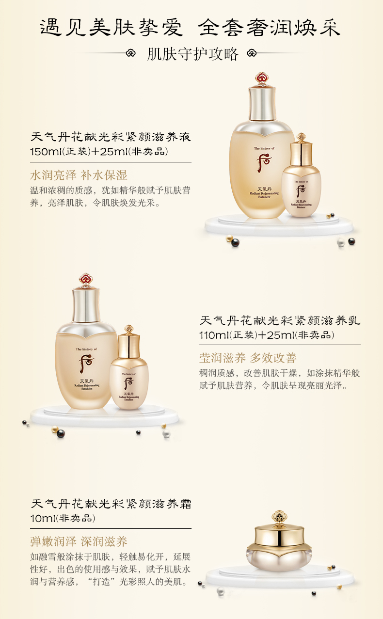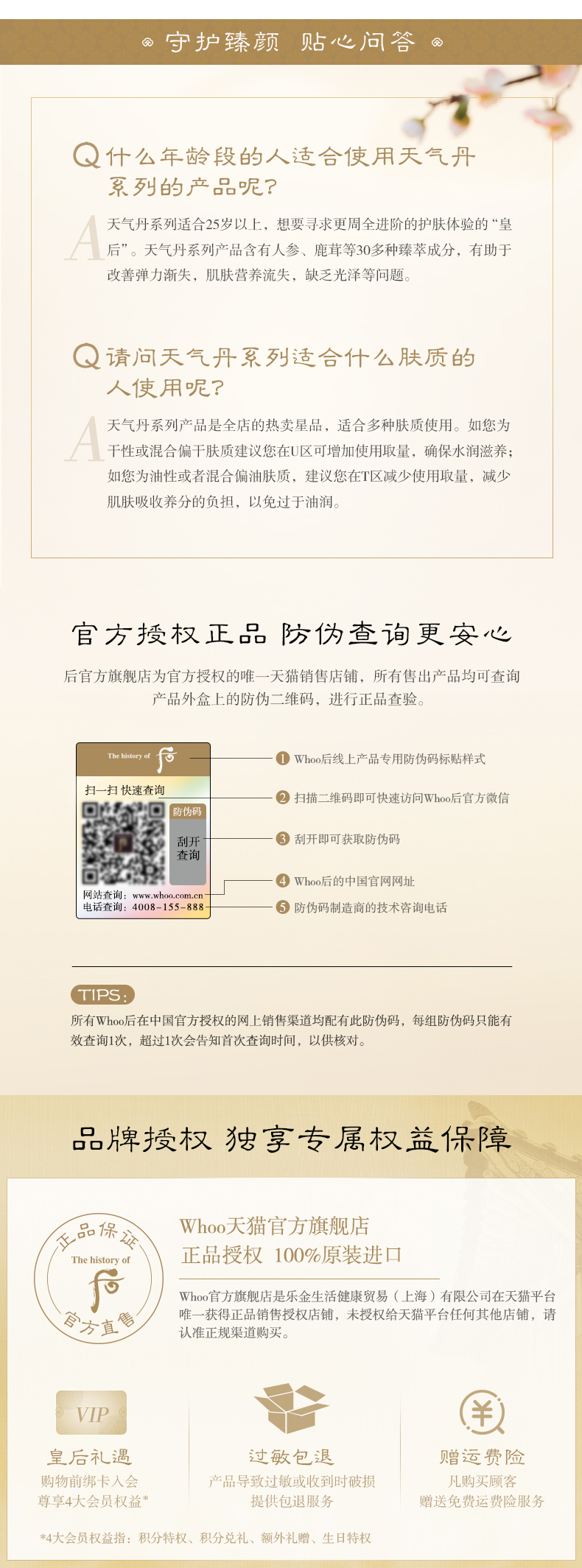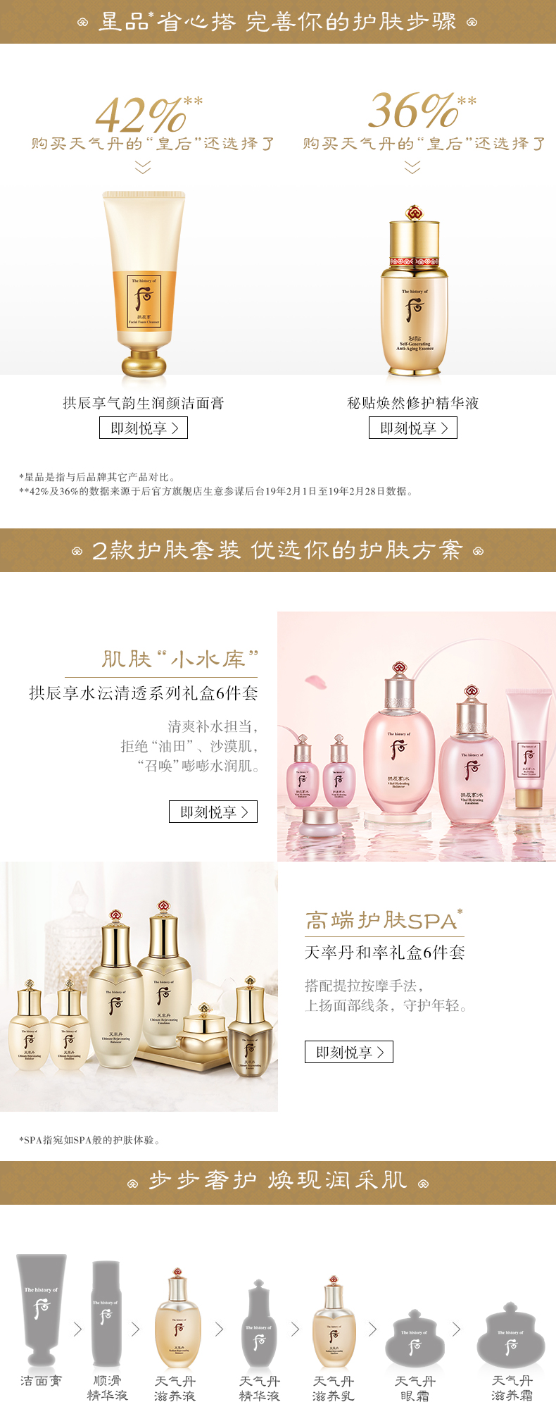 天气丹系列 被誉为后家“顶级系列”,有着最牛的广告语:“只要你五官没问题,我就能让你一直年轻下去”,被众多明星所推崇,功效几乎全能——综合护理、皮肤再生、抗皱、保湿、弹力、毛孔管理等等。因此适用年龄非常广,不管你是20岁,还是30岁,或者40岁,用它都合适。