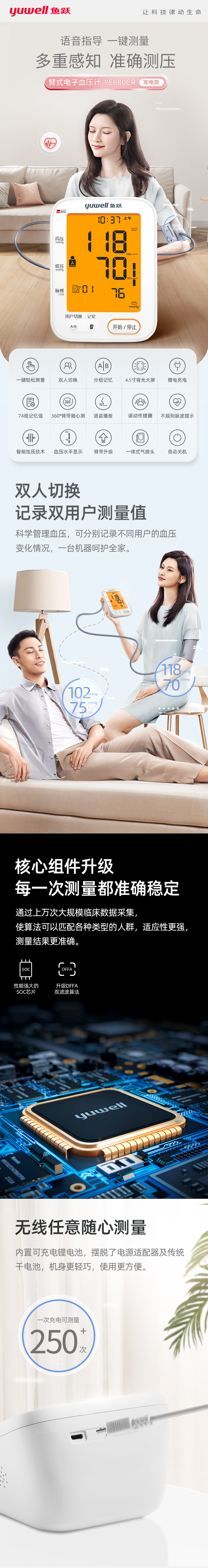 这款鱼跃 上臂式 高精度电子血压计,拥有双人切换、分组记忆、4.5寸背光大屏、74组记忆值、语音播报、误动作提醒、不规则脉搏提示、智能加压技术、血压水平显示等功能,非常齐全了。