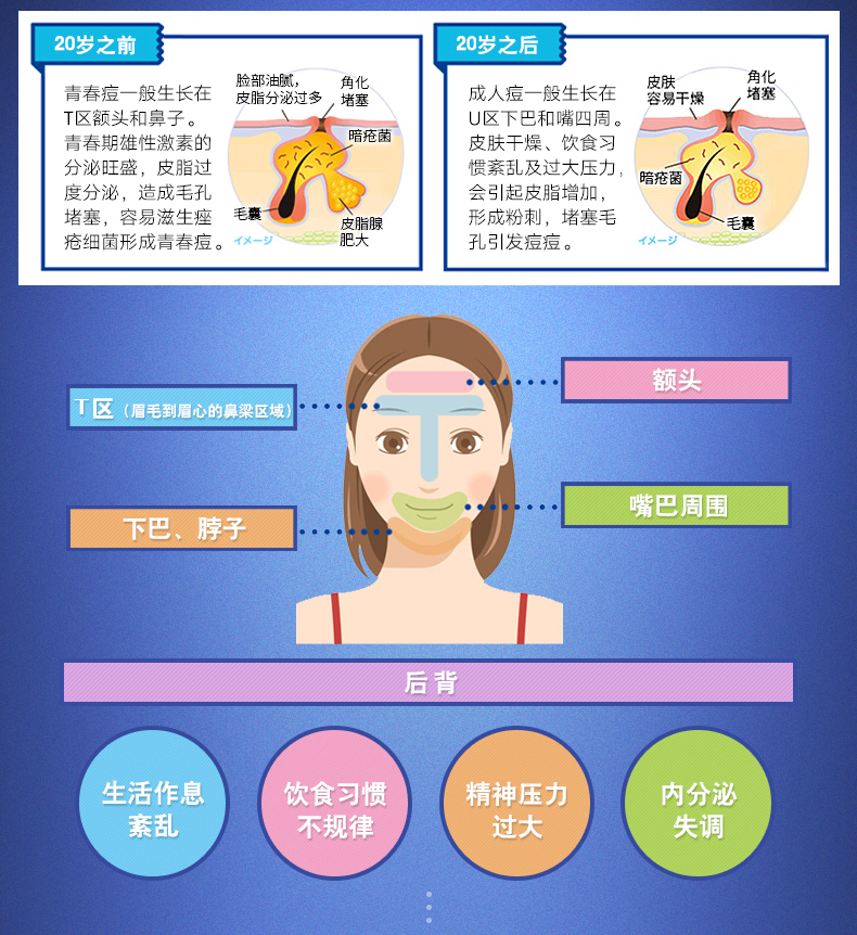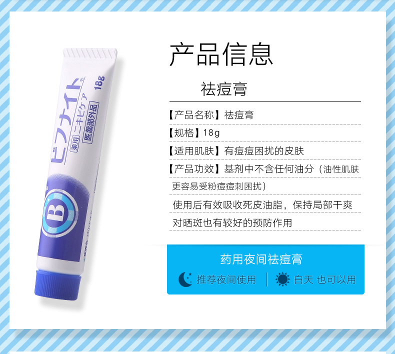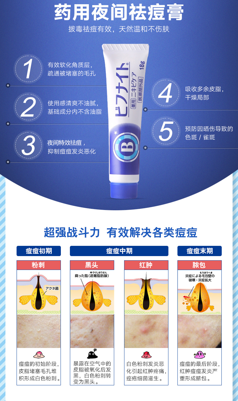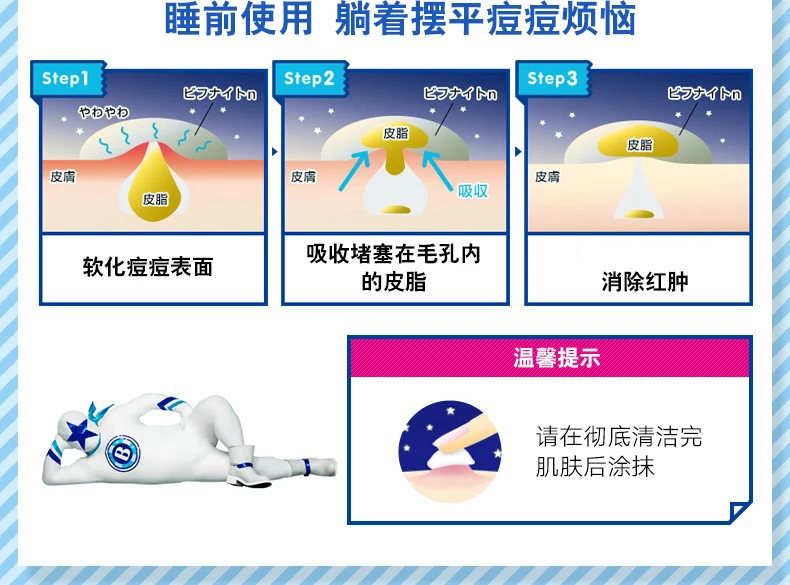 1.有效软化角质层,疏通被堵塞的毛孔。2.使用后感觉脸部肌肤清爽不油腻,基础成分内不含油脂。3.夜间特效祛痘,抑制痘痘发炎恶化。4.吸收多余皮脂,干燥局部。5.预防因晒伤导致的色斑/雀斑。