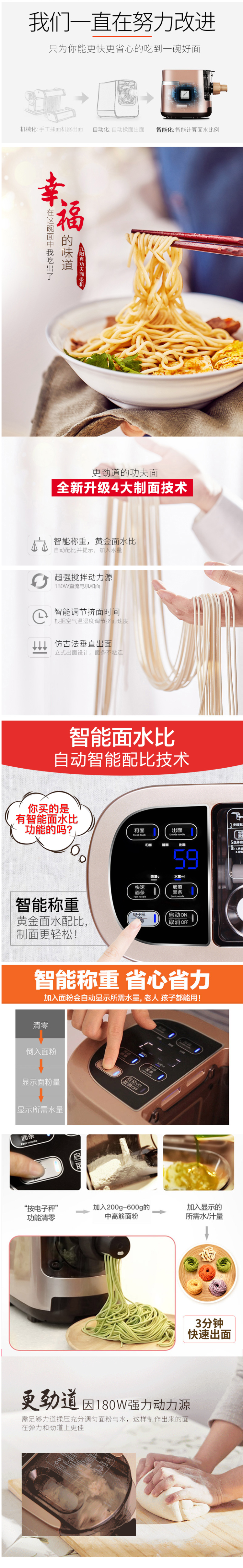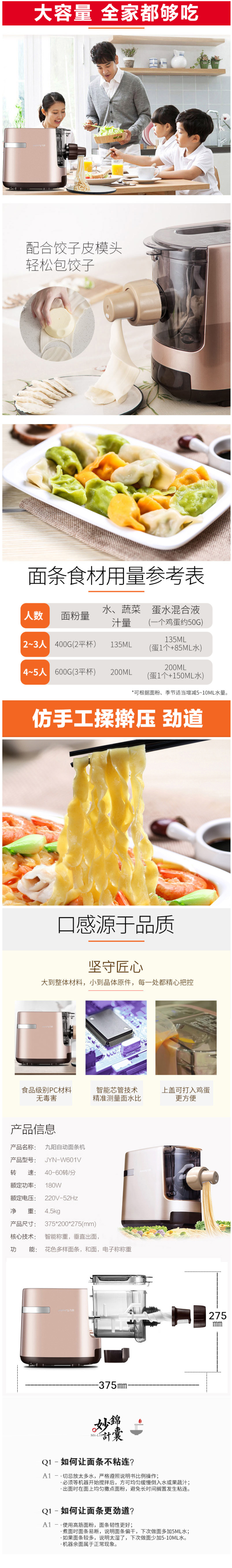 SMART CHIP智能芯管控制技术,自动调节和面时间和速度,还有断电记忆功能;立体三维和面杆,仿手工耐心揉压,加上三段螺旋挤压,制作出来的面条更劲道;配有6种模具头,可做细面、粗面、龙须面、手擀面、空心面、烩面,尺寸是375*200*275mm。