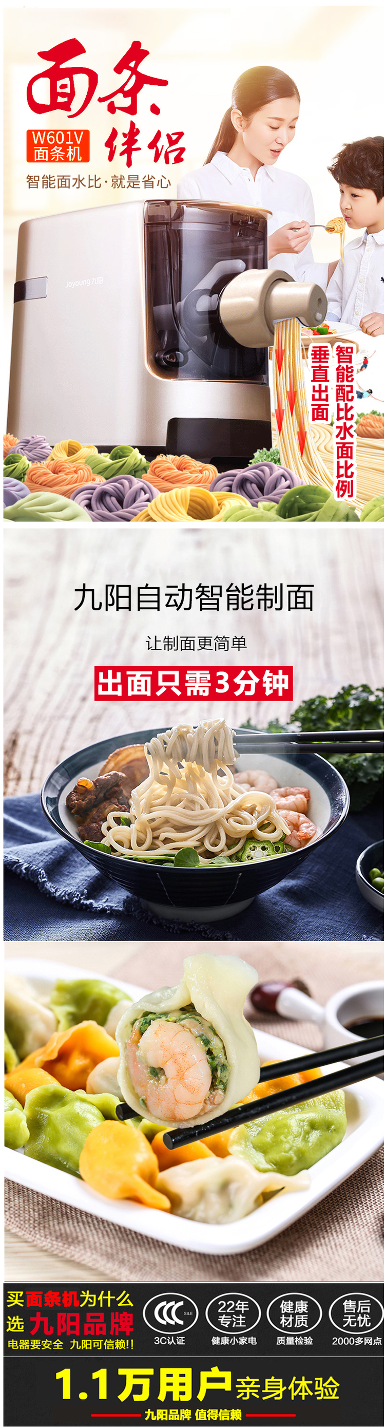 小编去年给家里买的九阳的初级款,需要自己根据说明上配比面水比例,比这款麻烦了一点,不过加点鸡蛋和盐之后,面条爽滑劲道,甩挂面10条街,比市场里的手擀面也要好吃、干净许多,小编最喜欢吃细面和手擀,剩下几种:龙须面不好下,容易粘;空心和粗面不入味;烩面太宽,太难下,买了以后就只有细面、手擀和饺子皮经常用,简直是神器。