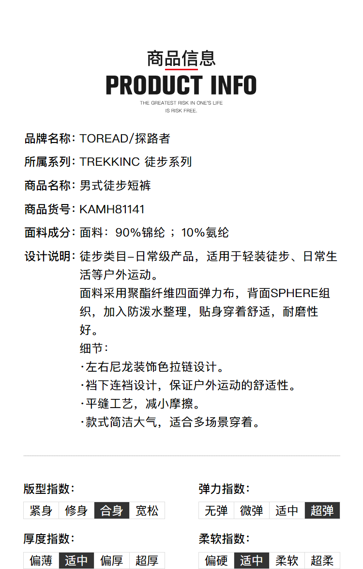这款探路者男防泼水透气速干短裤,属于徒步系列,使用90%尼龙+10%弹力混纺而成,速干透气,抗撕裂耐磨损,表面还加持了防泼水处理,无惧小雨。