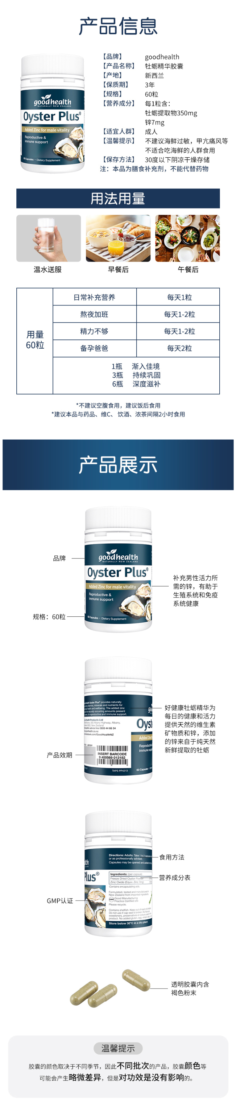 这款Goodhealth牡蛎精华胶囊,新西兰原装进口,采用新西兰海域中的牡蛎制成,天然纯净,每粒含有350毫克的牡蛎粉,1颗牡蛎胶囊等于7只牡蛎;牡蛎中含有大量的精氨酸与促进额尔蒙分泌的微量元素亚铅,长期服用,可保护生殖系统。