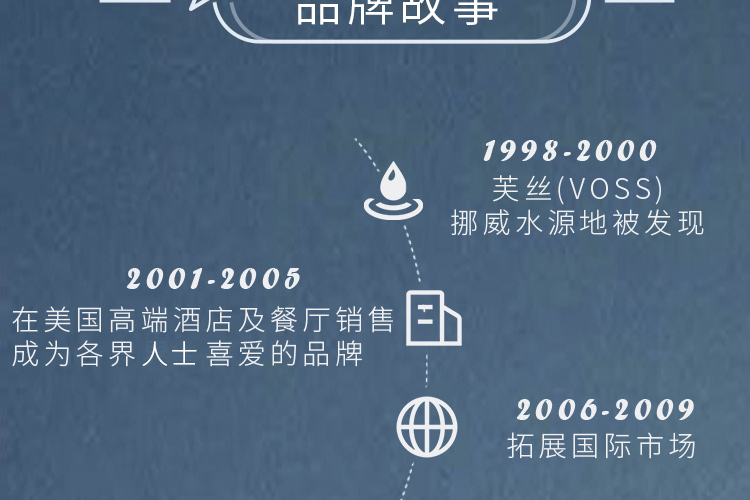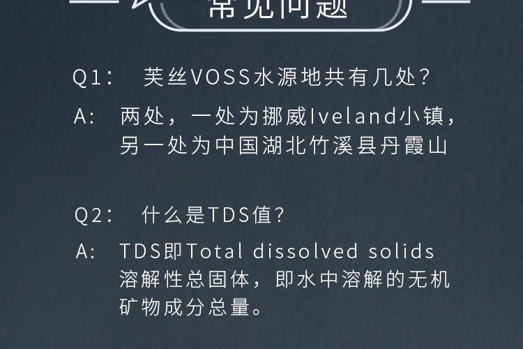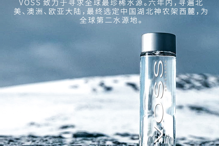 Voss是北欧挪威的饮用水品牌,是目前全世界最顶级的饮用水,在2009年成为达沃斯论坛的指定用水,受各国政府首脑及王室贵族所青睐,同时由于水的口感纯净清冽,也受到了许多好莱坞明星的青睐。