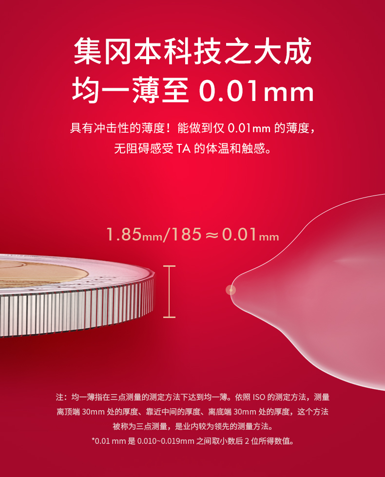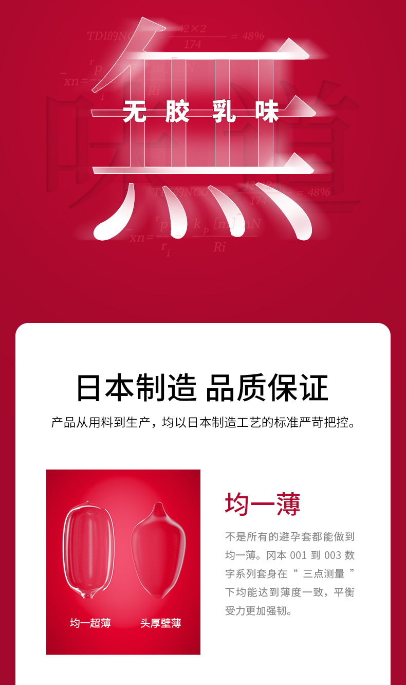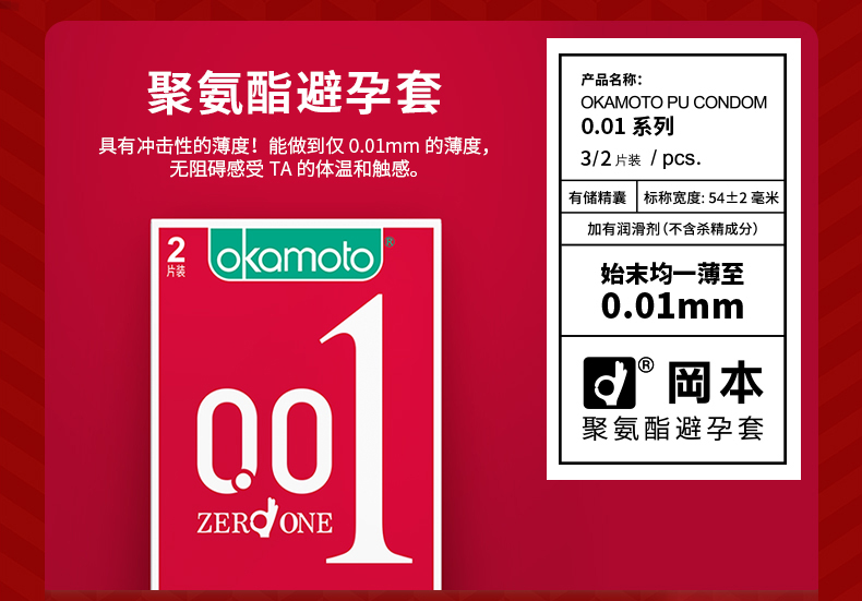 冈本003是厚度为0.03MM的避孕套,冈本001则是0.01MM。据研究显示,避孕套的厚度每下降0.01MM,男性的快感就会随之提高百分之二十。从冈本003到001的改变,可以说瞬间提高了男性百分之四十的快感了。